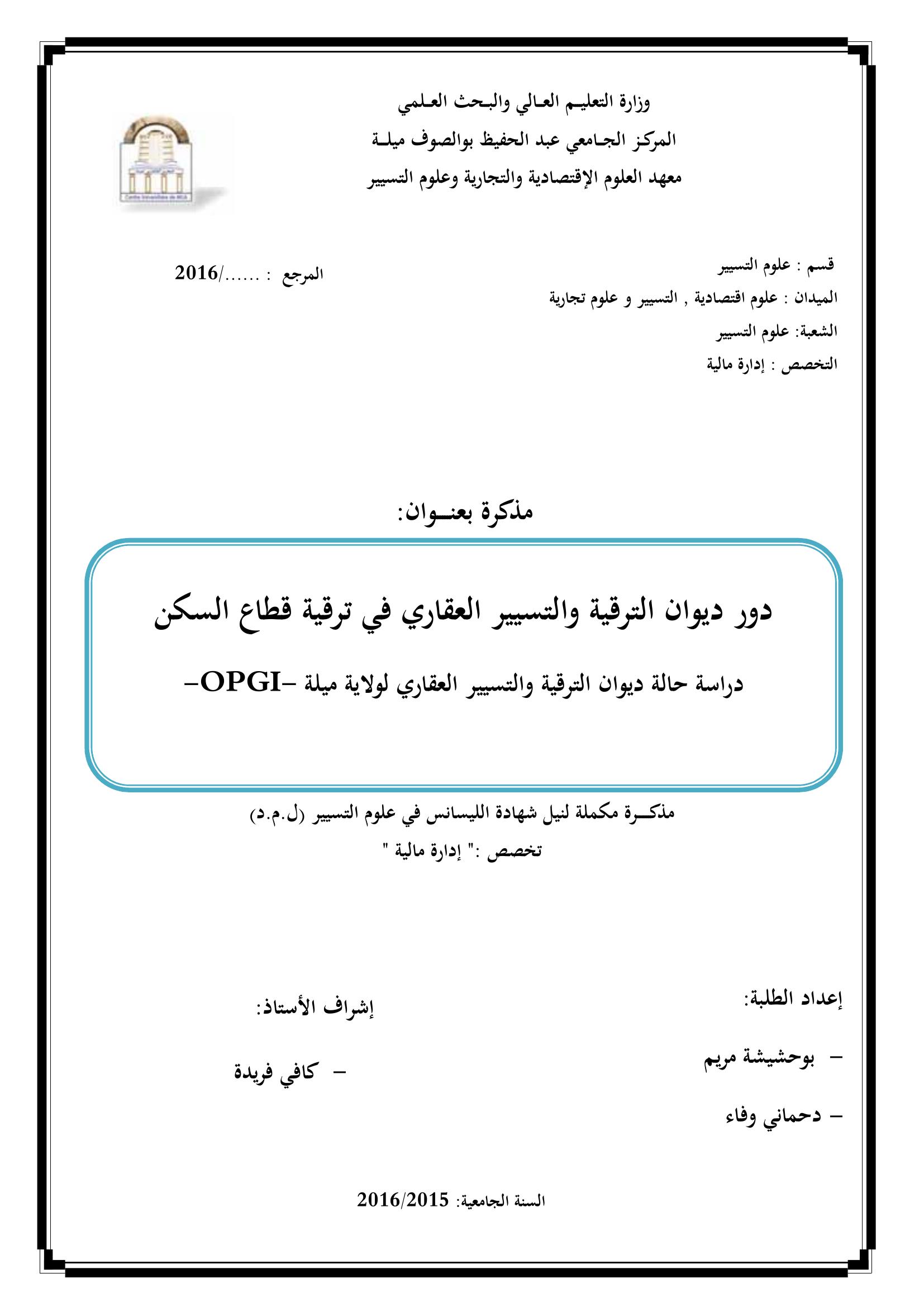 بوحشيشة مريم & كافي فريدة (مشرفا) (2016). دور ديوان الترقية والتسيير العقاري في ترقية قطاع السكن : دراسة حالة ديوان الترقية والتسيير العقاري لولاية ميلة OPGI.