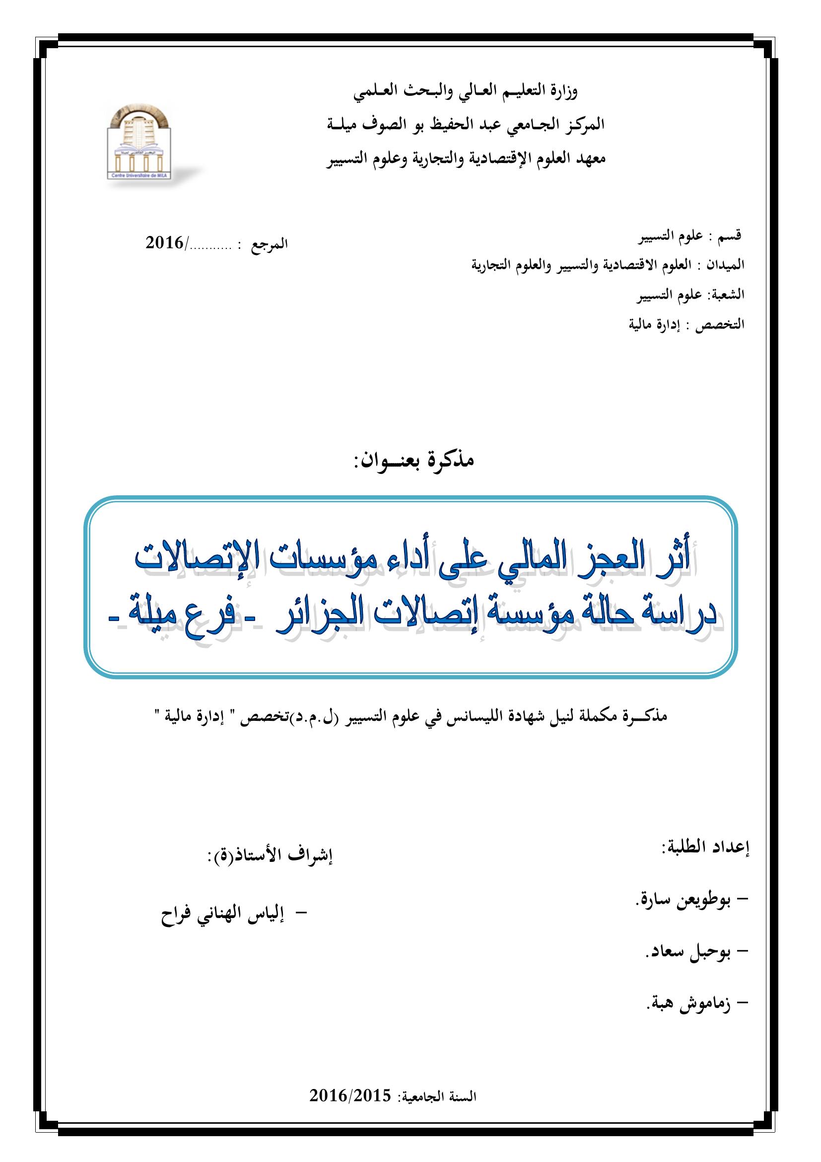 أثر العجز المالي على أداء مؤسسات الإتصال : دراسة حالة شركة إتصالات الجزائر فرع ميلة