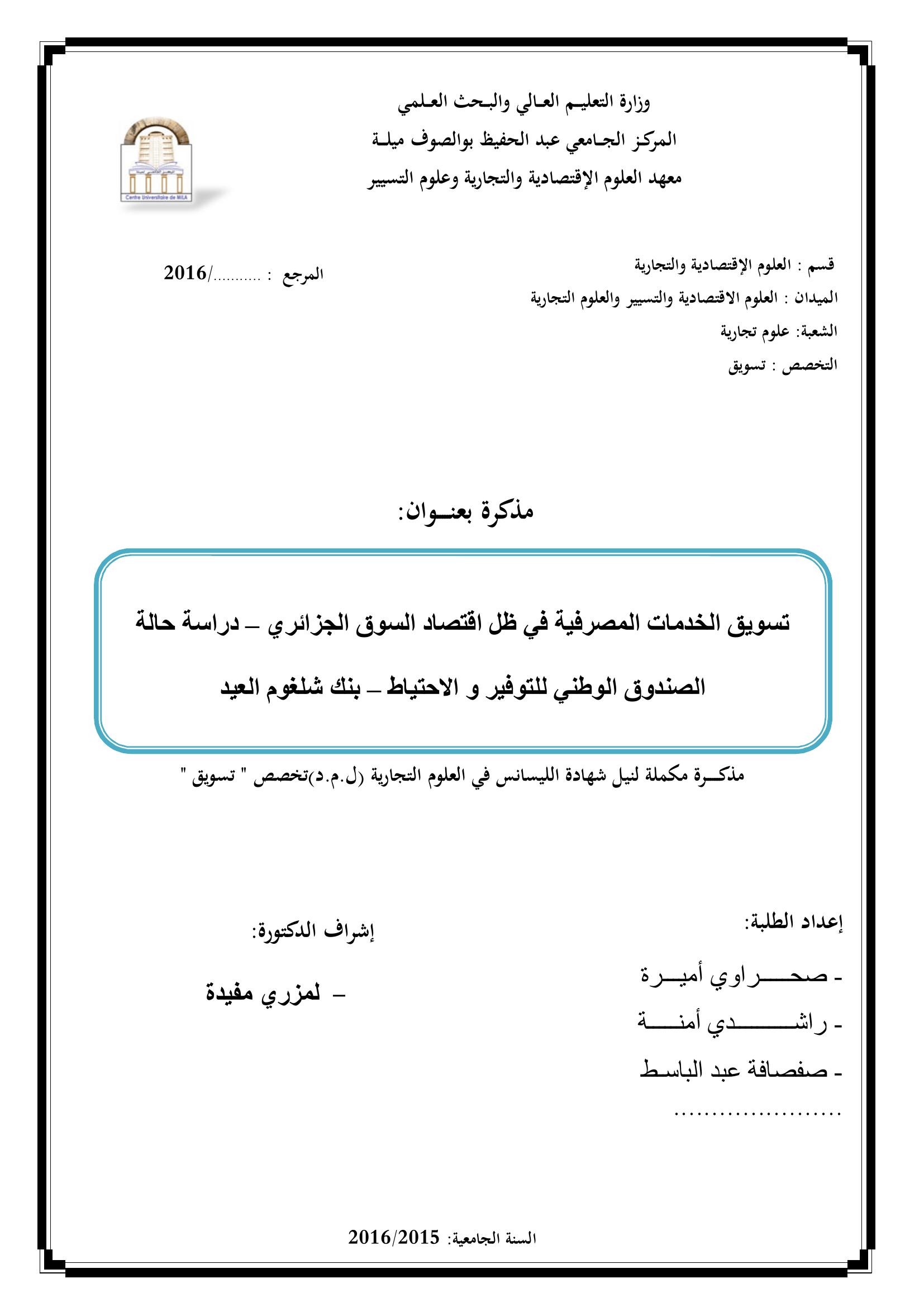 صحراوي أميرة & لمزري مفيدة(مشرفا) (2016). تسويق الخدمات المصرفية في ظل إقتصاد السوق الجزائري -دراسة حالة الصندوق الوطني للتوفير والإحتياط بنك شلغوم العيد.