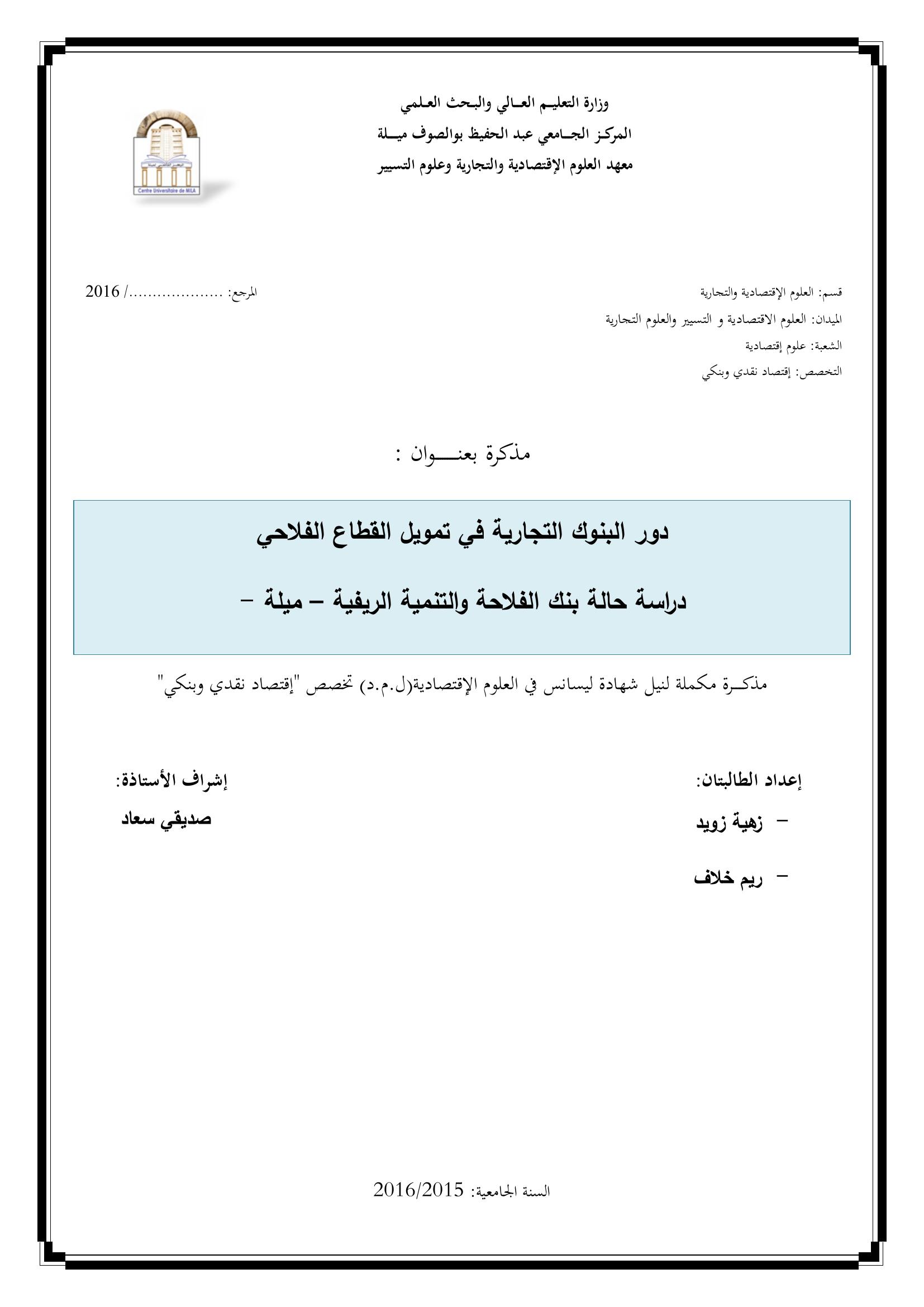 زويد زهية & صديقي سعاد(مشرفا) (2016). دور البنوك التجارية في تمويل القطاع الفلاحي : دراسة حالة بنك الفلاحة والتنمية الريفية -ميلة-.