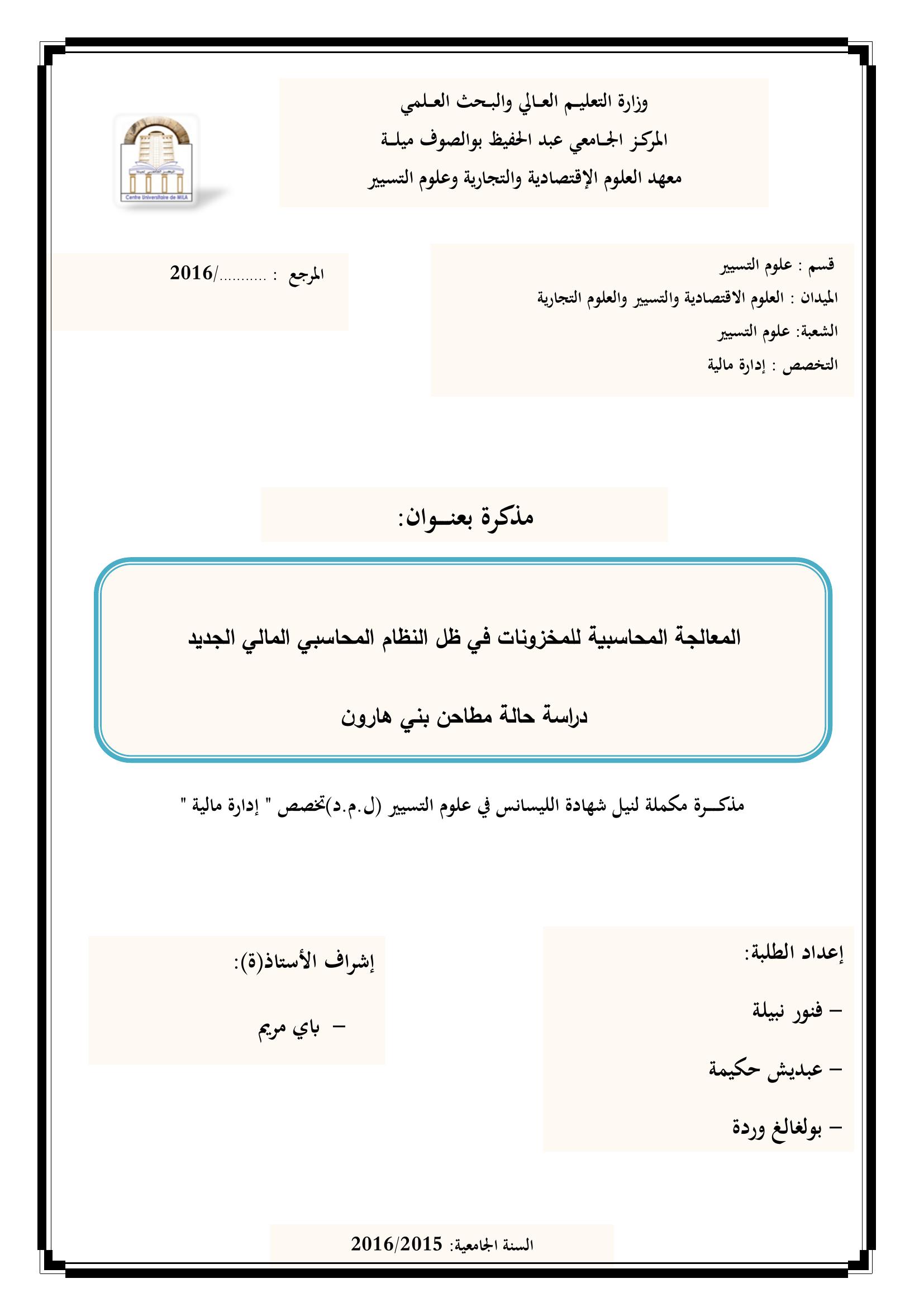 فنور نبيلة & باي مريم (مشرفا) (2016). المعالجة المحاسبية للمخزونات في ظل النظام المحاسبي المالي الجديد : دراسة حالة مطاحن بني هارون.