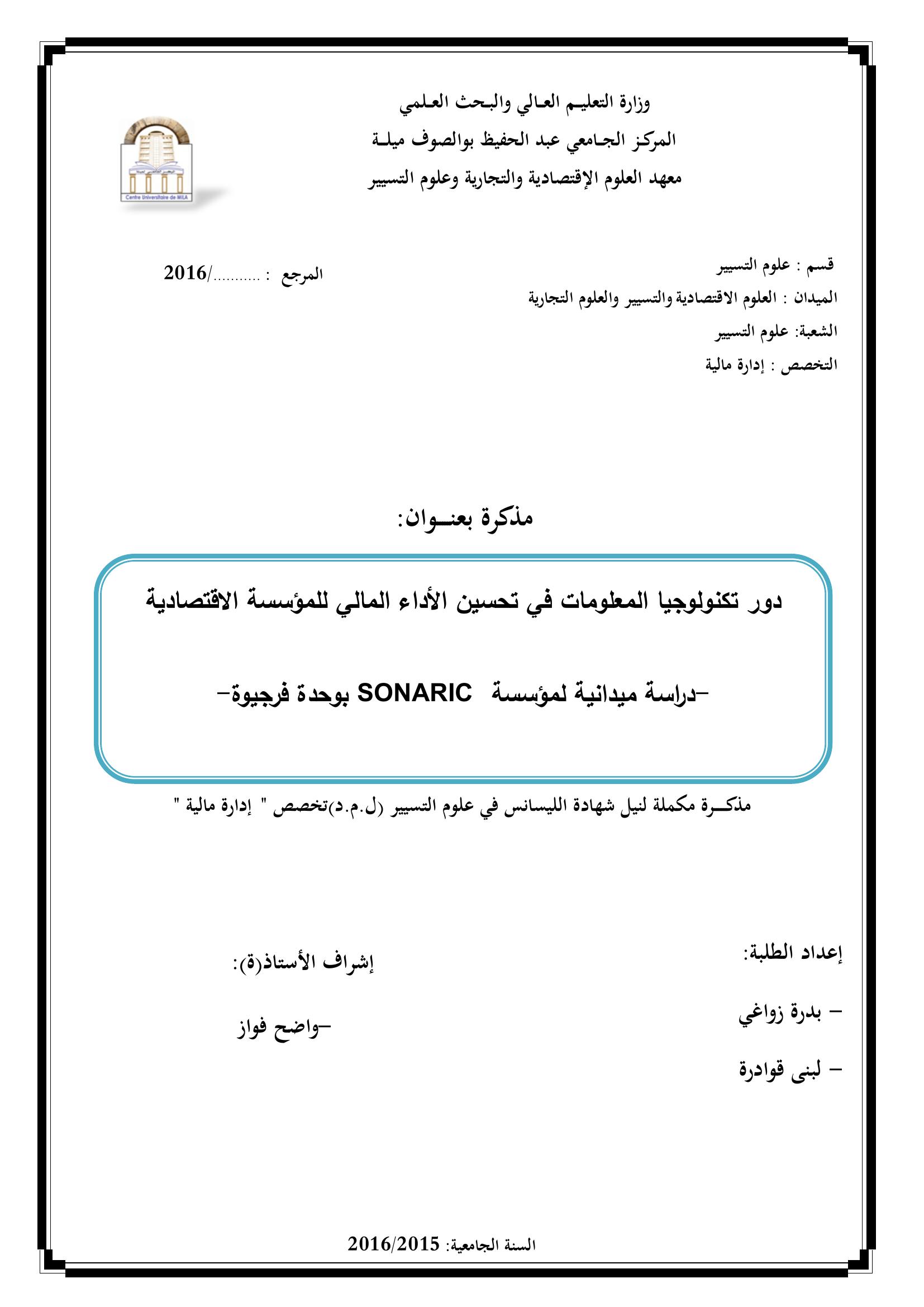 بدرة زواغي & واضح فواز (مشرفا) (2016). دور تكنولوجيا المعلومات في تحسين الأداء المالي للمؤسسة الاقتصادية : دراسة ميدانية لموسسة SONARIC بوحدة فرجيوة.