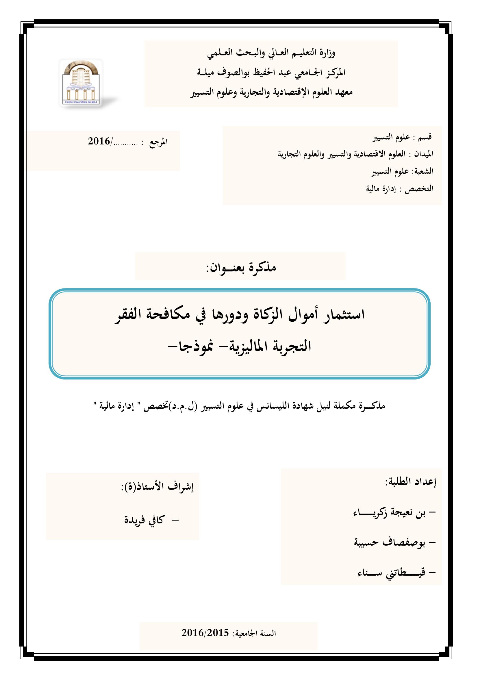 بن نعيجة زكرياء & كافي فريدة (مشرفا) (2016). إستثمار أموال الزكاة ودورها في مكافخة الفقر التجربة الماليزية نموذجا.