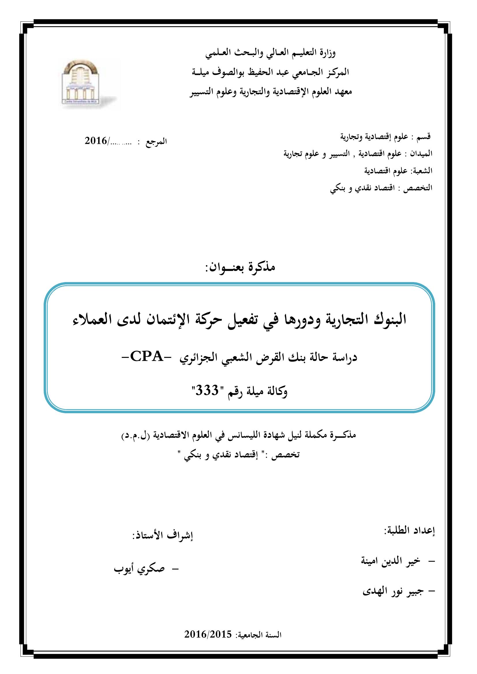 خير الدين امينة & صكري أيوب (مشرفا) (2016). البنوك التجارية و دورها في تفعيل حركة الإئتمان لدى العملاء : دراسة حالة بنك القرض الشعبي الجزائري-CPA- وكالة ميلة رقم ''333''.