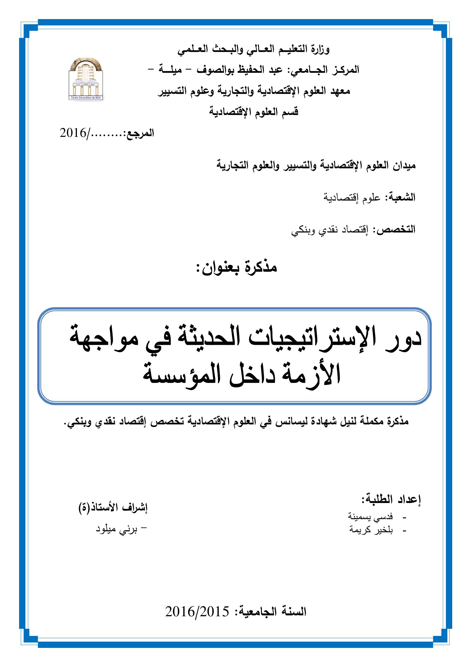 فدسي يسمينة & برني ميلود (مشرفا) (2016). دور الإستراتيجيات الحديثة في مواجهة الأزمة داخل المؤسسة.
