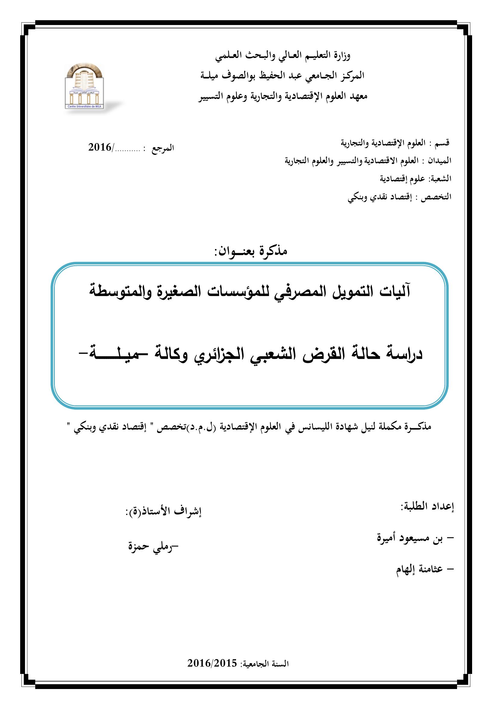 آليات التمويل المصرفي للمؤسسات الصغيرة والمتوسطة : دراسة حالة القرض الشعبي الجزائري وكالة ميلة