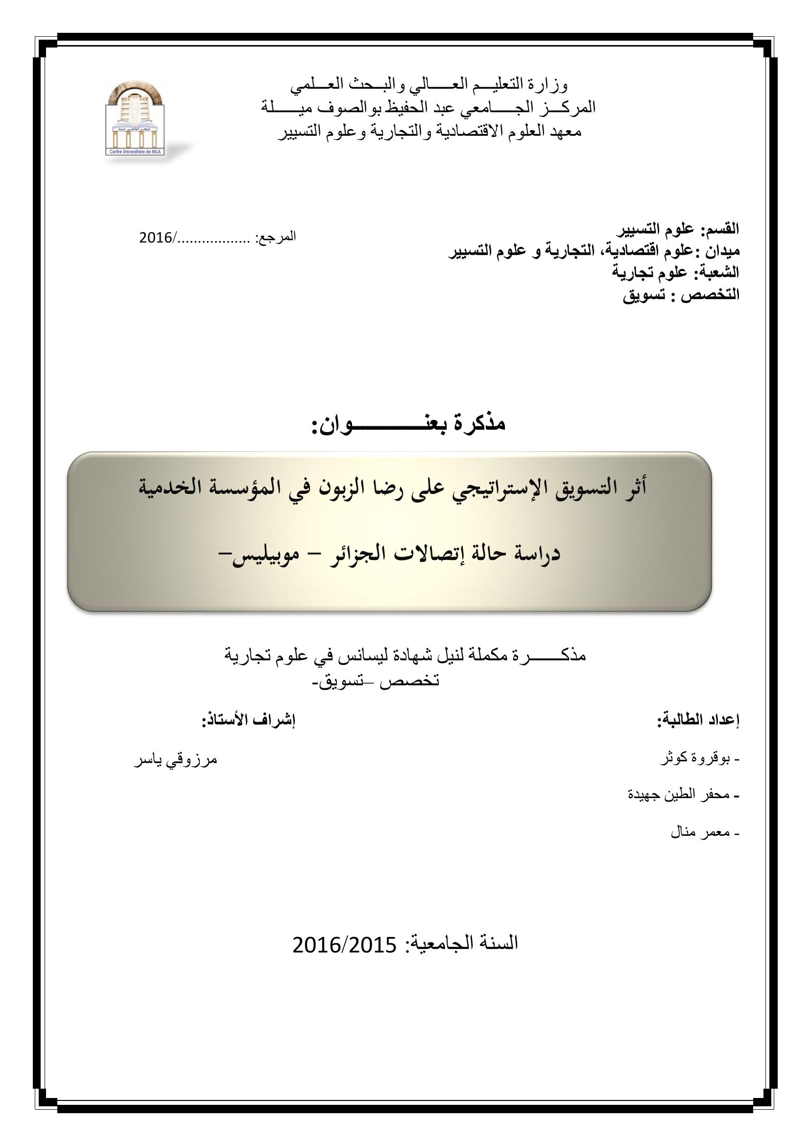 بوقروة كوثر & مرزوقي ياسر (مشرفا) (2016). اثر التسويق الإستراتيجي على رضا الزبون في المؤسسة الخدمية : دراسة حالة إتصالات الجزائر -موبليس-.