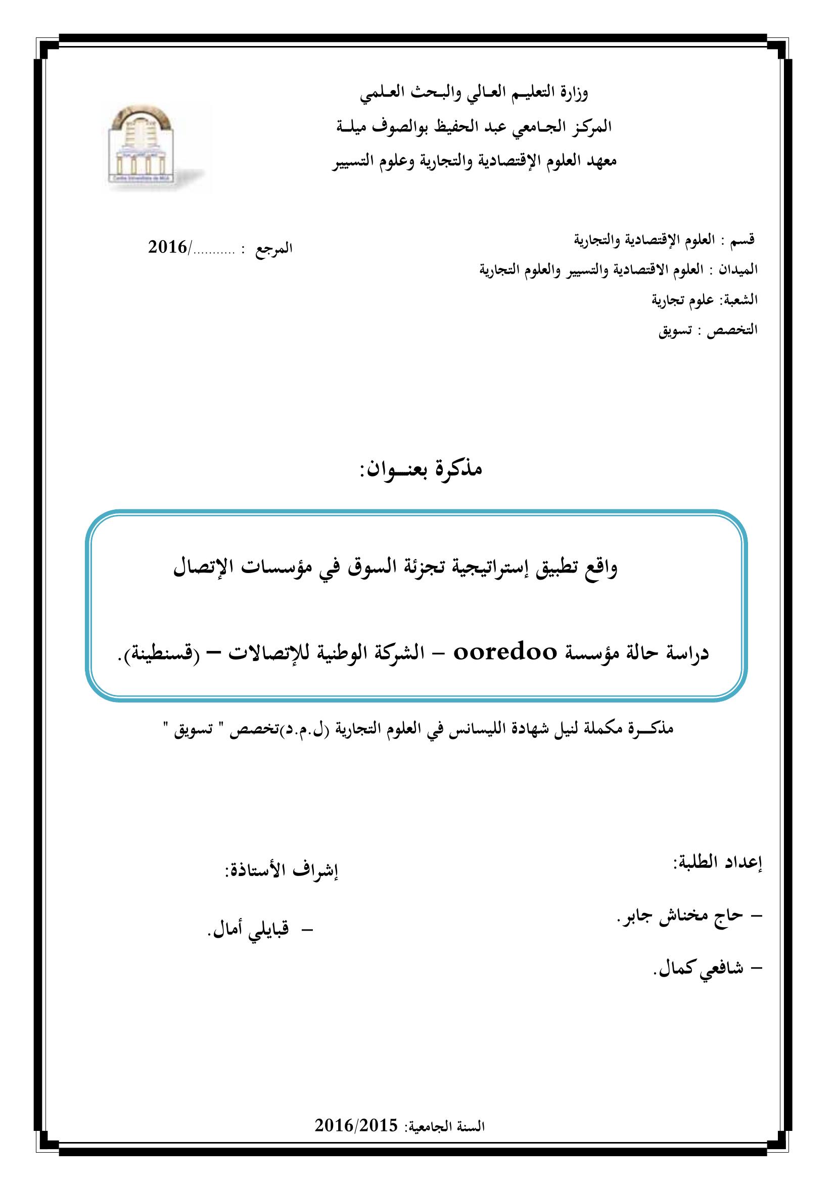حاج مخناش جابر & قبايلي أمال (مشرفا) (2016). واقع تطبيق إستراتيجية تجزئة السوق في مؤسسات الإتصال : دراسة حالة مؤسسة ORREDO الشركة الوطنية للإتصالات (قسنطينة).