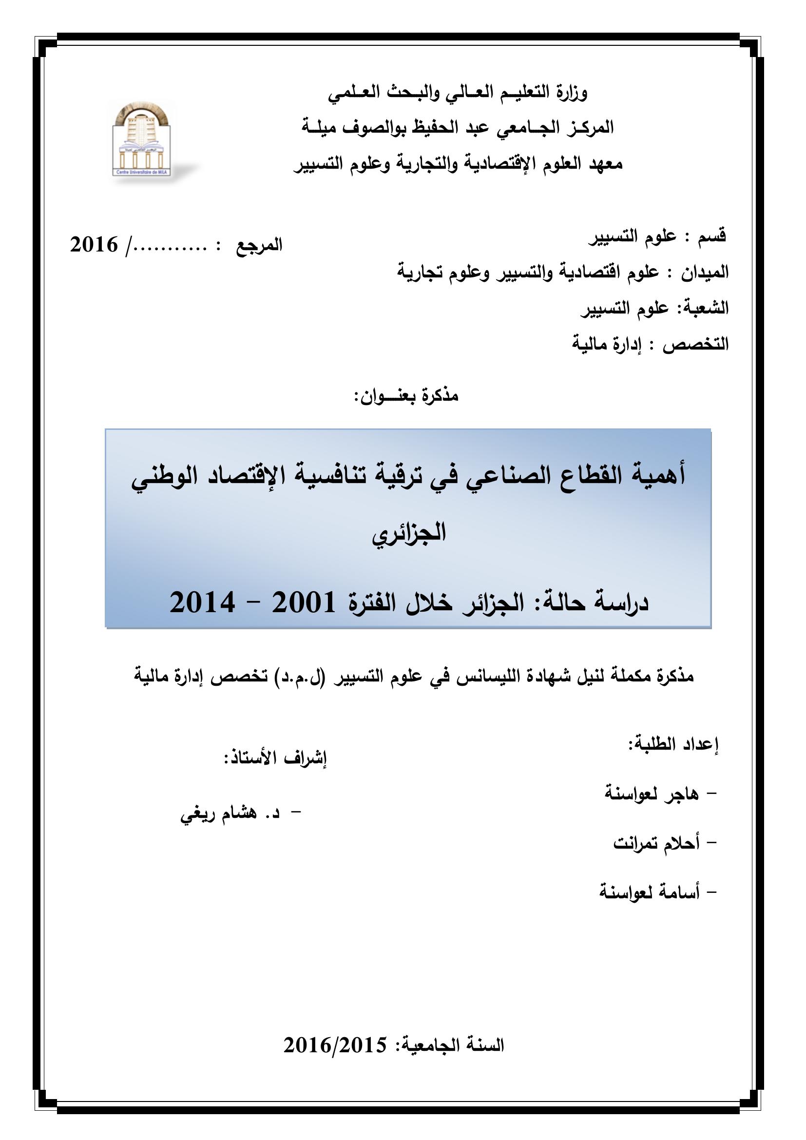 هاجر لعواسنة & ريغي هشام (مشرفا) (2016). أهمية القطاع الصناعي في ترقية تنافسية الإقتصاد الوطني الجزائري : دراسة حالة الجزائر خلال الفترة 2001-2014.