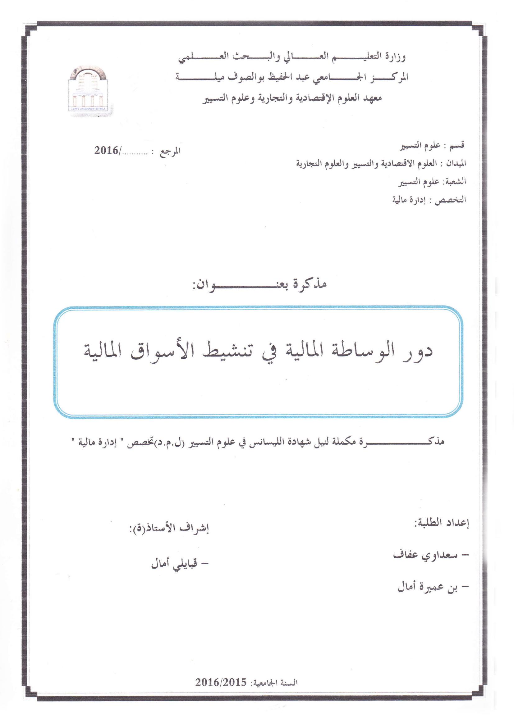 سعداوي عفاف & قبايلي أمال (مشرفا) (2016). دور الوساطة المالية في تنشيط الأسواق المالية.