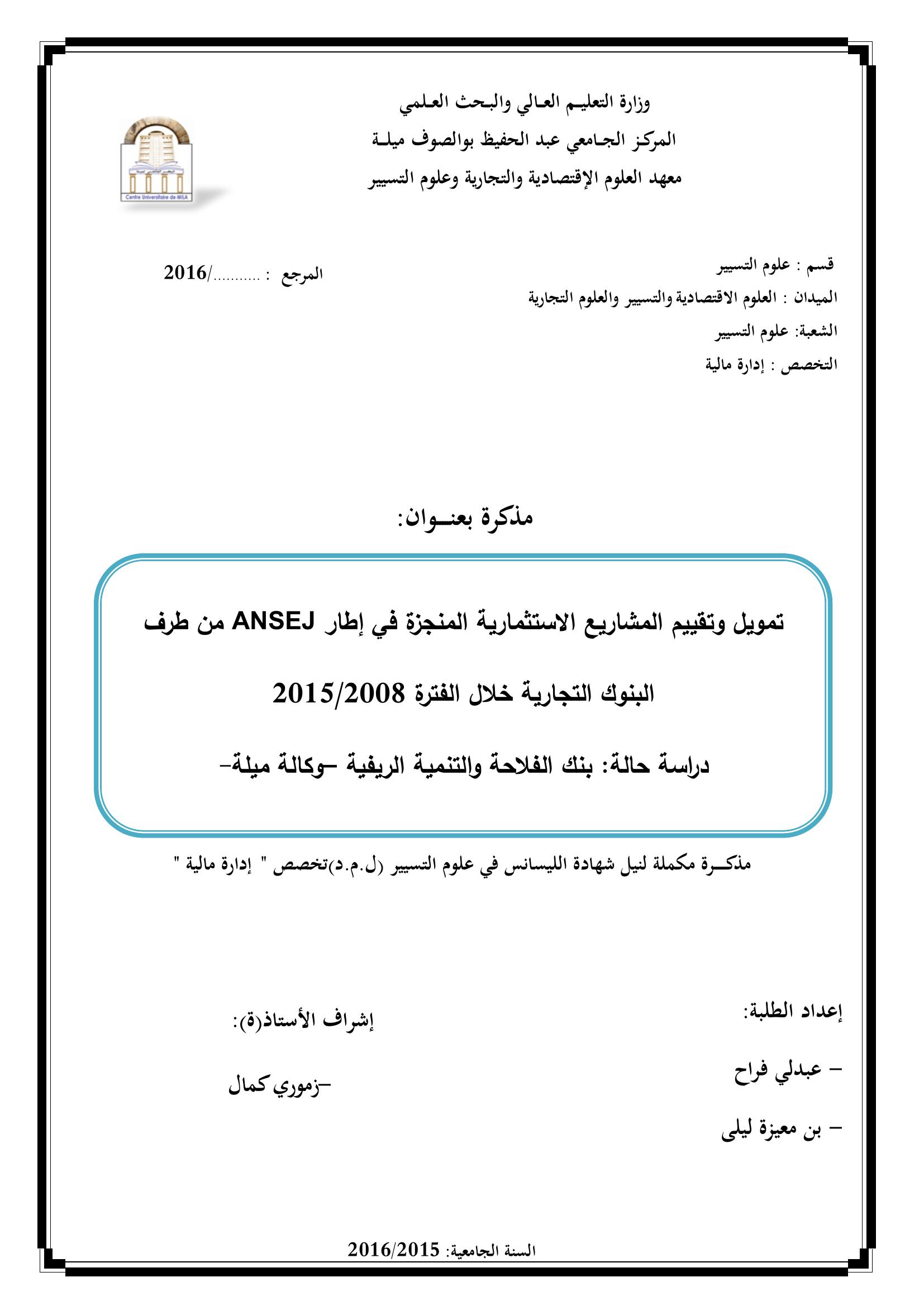 عبدلي فراح & زموري كمال (مشرفا) (2016). تمويل و تقييم المشاريع الاستثمارية المنجزة في إطار من طرف البنوك التجارية خلال الفترة 2015/2008 : دراسة حالة بنك الفلاحة و التنمية الريفية -وكالة ميلة-.