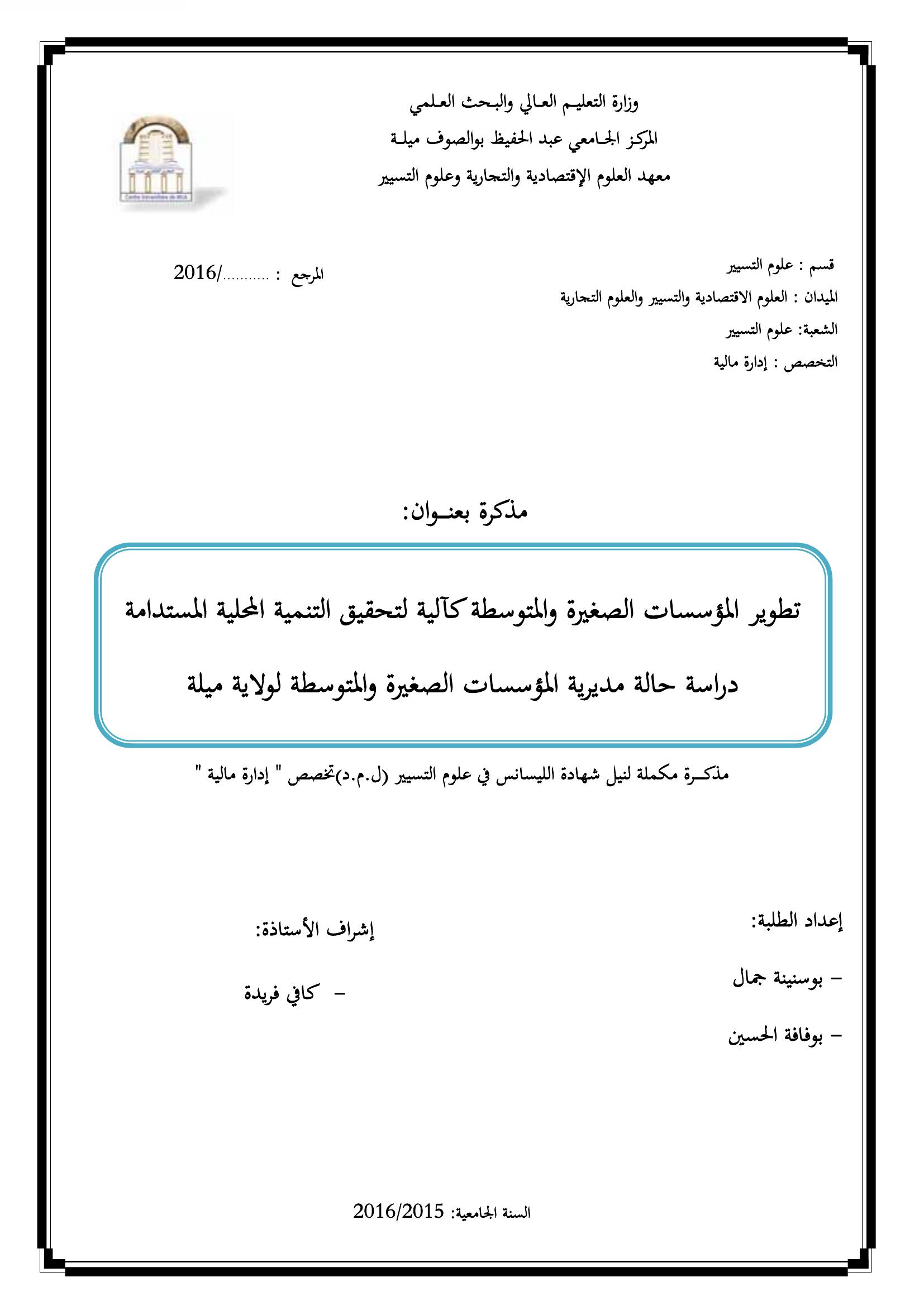 بوسنينة جمال & كافي فريدة (مشرفا) (2016). تطوير المؤسسات الصغيرة والمتوسطة كآلية لتحقيق التنمية المحلية المستدامة : دراسة حالة مديرية المؤسسات الصغيرة والمتوسطة لولاية ميلة.