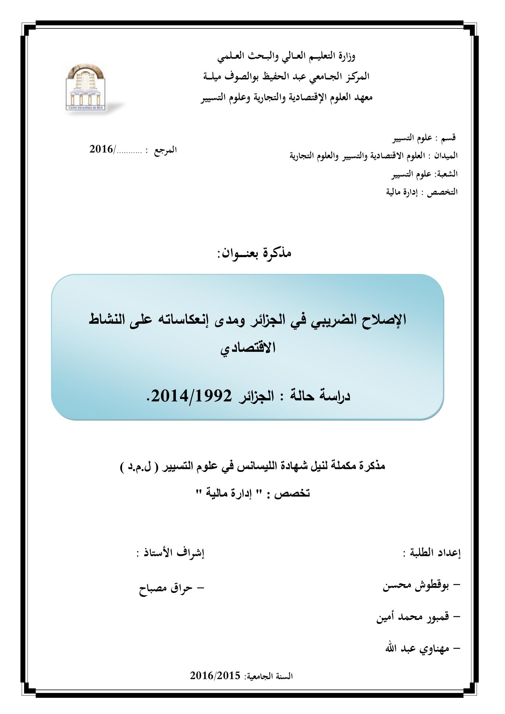 بوقطوش محسن & حراق مصباح (مشرفا) (2016). الإصلاح الضريبي في الجزائر ومدى إنعكاساته على النشاط الإقتصادي : دراسة حالة الجزائر 1992/2014.