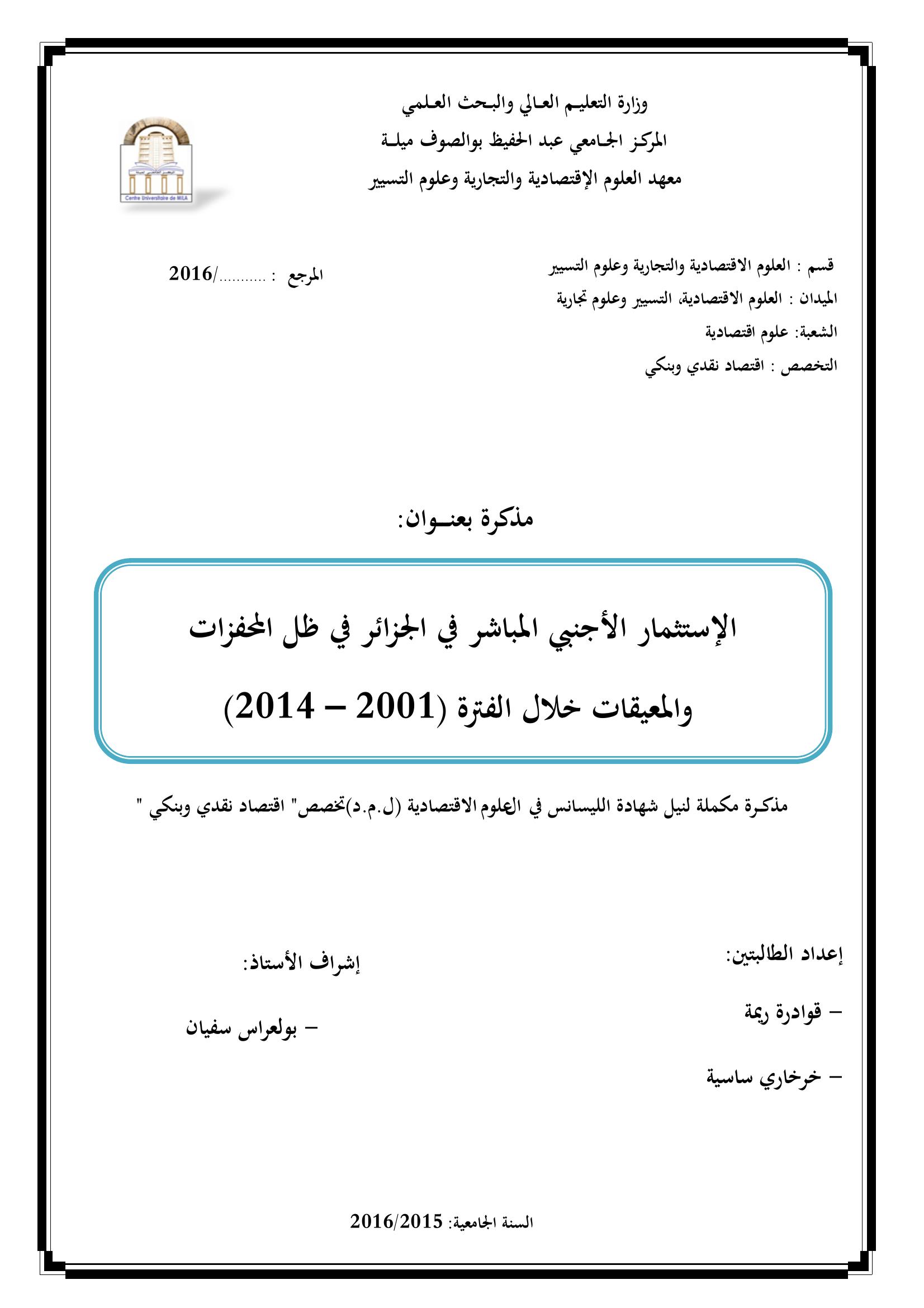 قوادرة ريمة & بولعراس سفيان(مشرفا) (2016). الإستثمار الأجنبي المباشر في الجزائر في ظل المحفزات والمعيقات خلال الفترة (2001-2014).