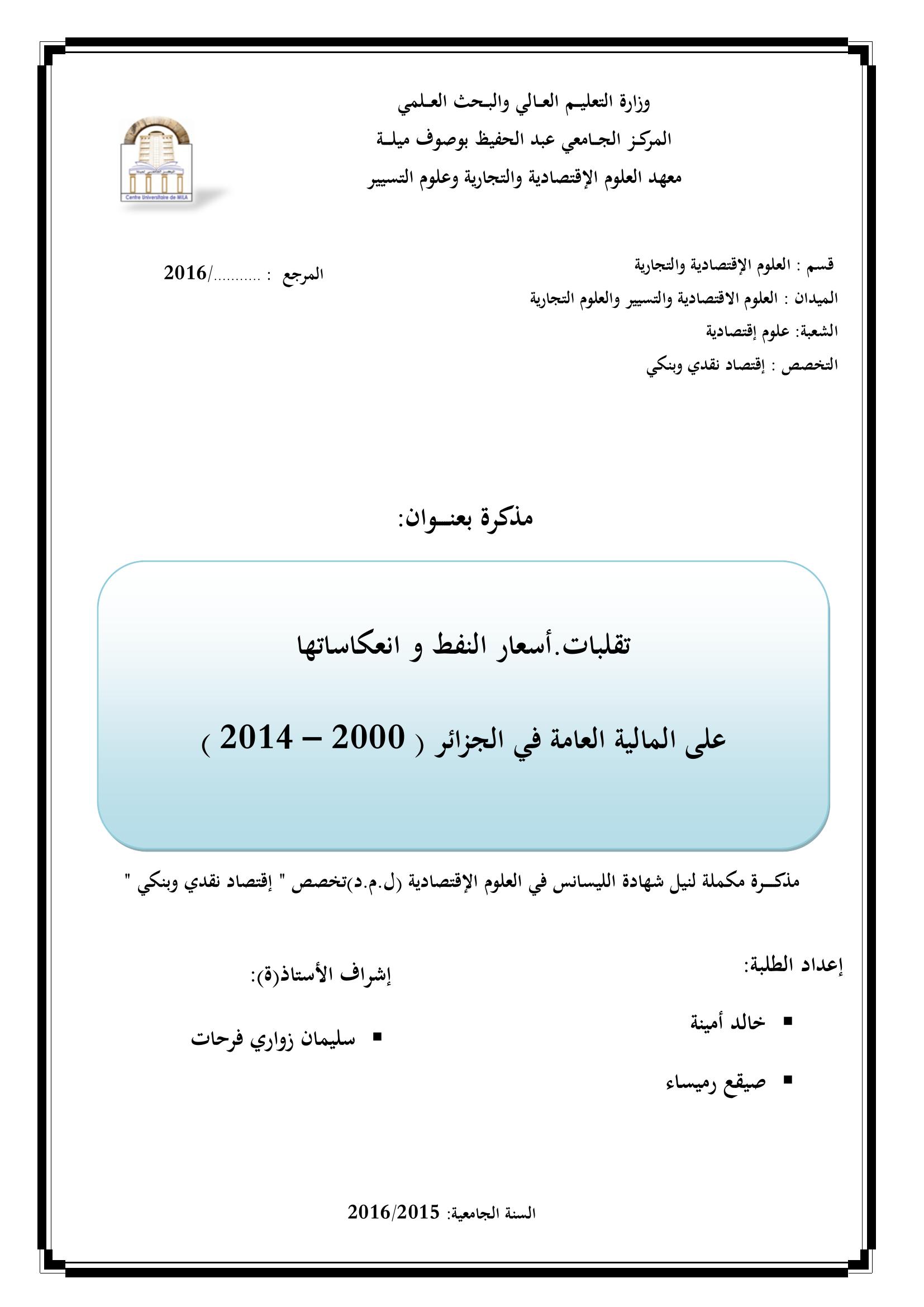 خالد أمينة & سليمان زواري فرحات (مشرفا) (2016). تقلبات أسعار النفط وانعكاساتها على المالية العامة في الجزائر (2000-2014).