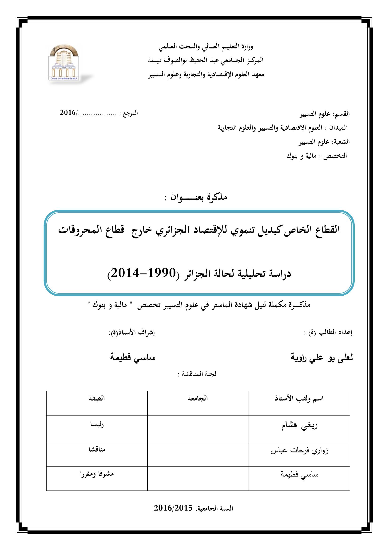 لعلي بوعلي راوية & ،ريغي هشام(رئيسا)، زواري فرحات عباس(مناقشا)، ساسي فطيمة(مشرفا ومقررا) (2016). القطاع الخاص كبديل تنموي للإقتصاد الجزائري خارج قطاع المحروقات : دراسة تحليلية لحالة الجزائر (1990-2014).