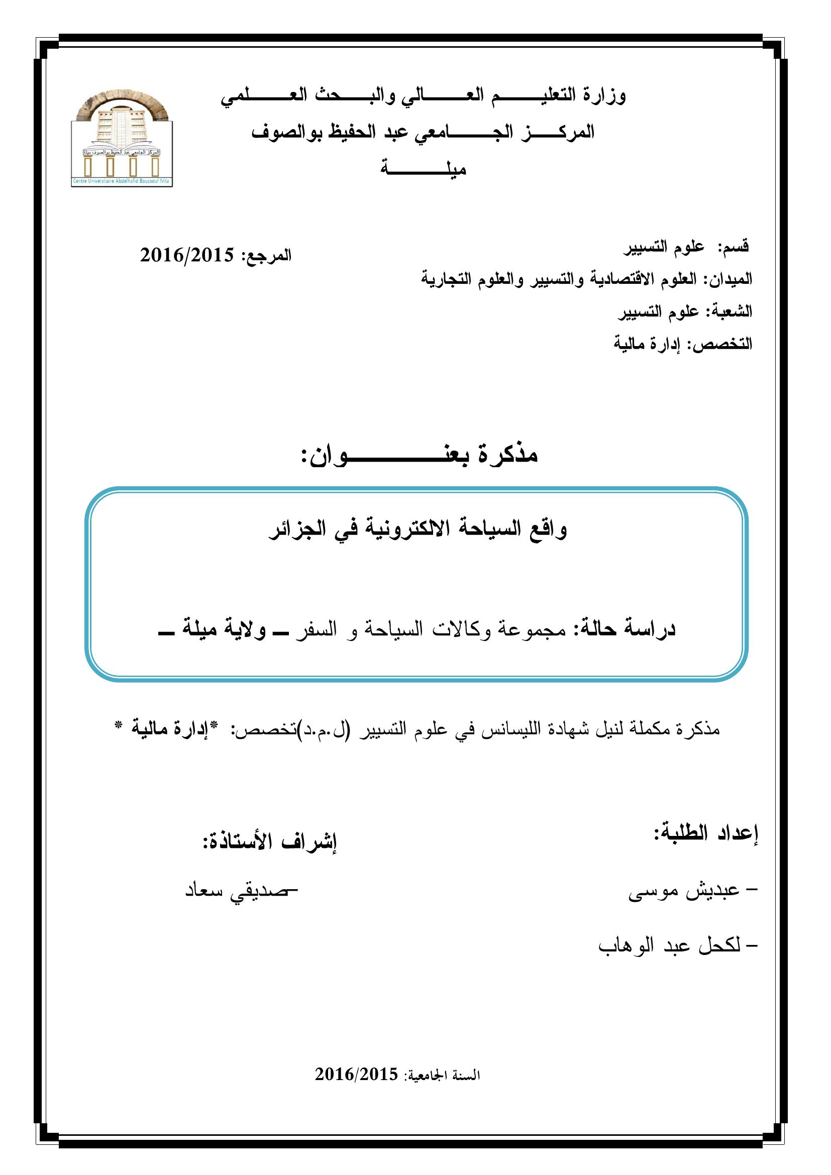عبديش موسى & صديقي سعاد(مشرفا) (2016). واقع السياحة الالكترونية في الجزائر : دراسة حالة : مجموعة وكالات السياحة و السفر - ولاية ميلة -.