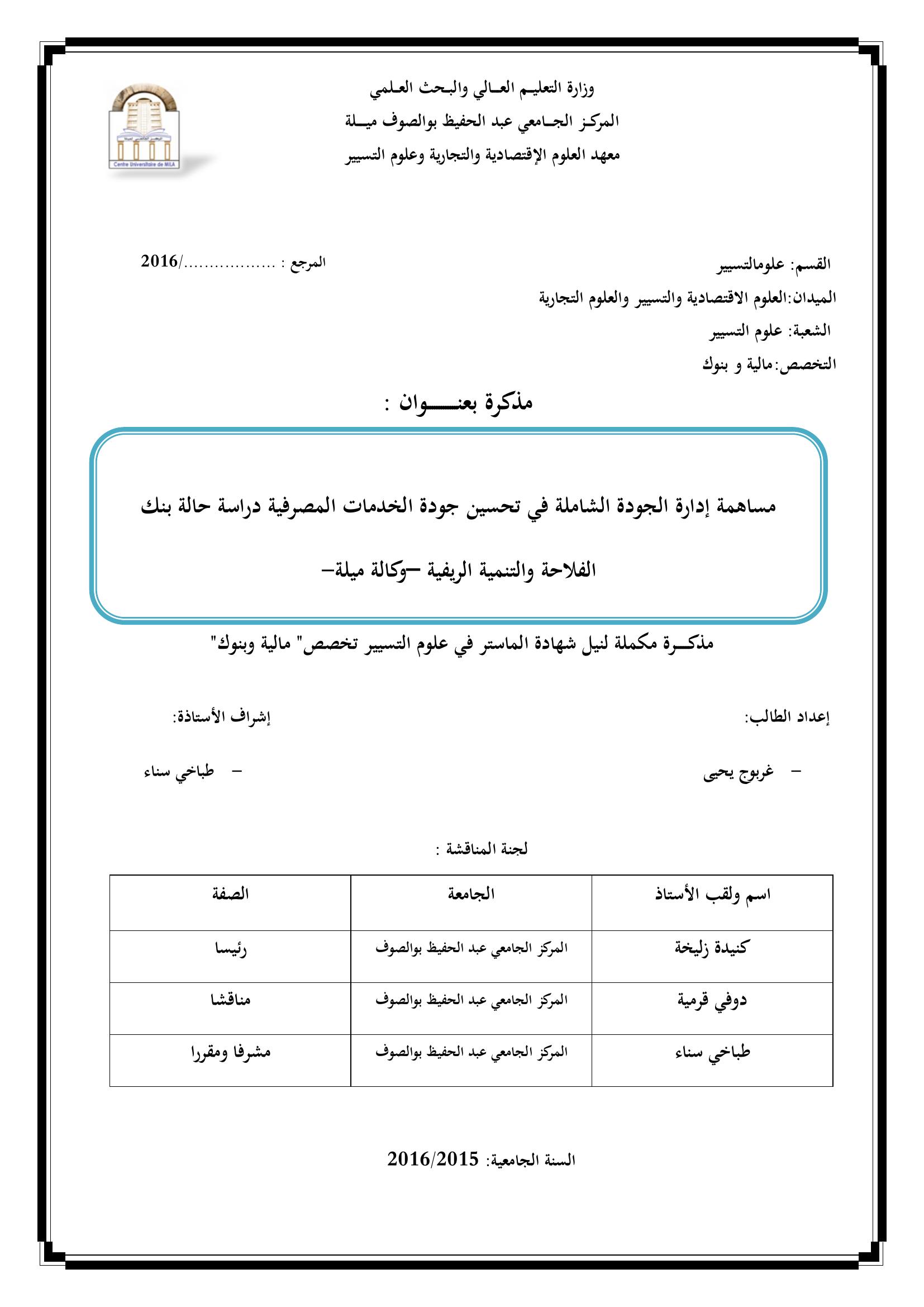 مساهمة إدارة الجودة الشاملة في تحسين جودة الخدمات المصرفية دراسة حالة بنك الفلاحة و التنمية الريفية - وكالة ميلة-