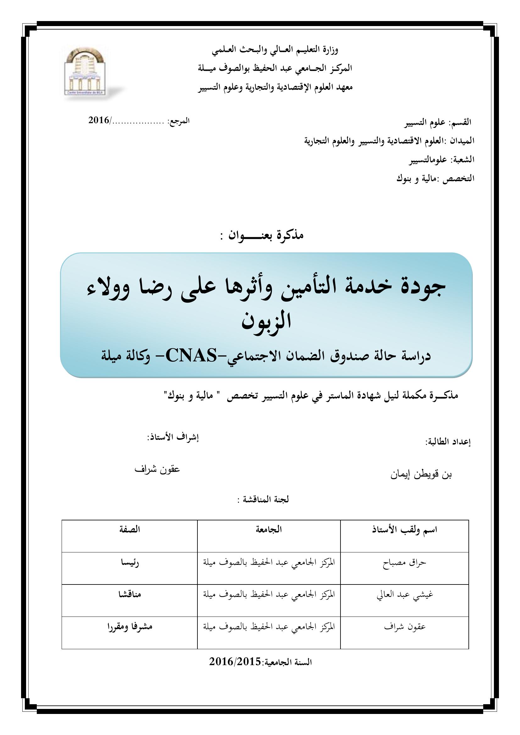 بن قويطن إيمان & حراق مصباح (رئيسا), غ. (2016). جودة خدمة التأمين وأثرها على رضا وولاء الزبون دراسة حالة صندوق الضمان الإجتماعي CNAS وكالة ميلة.