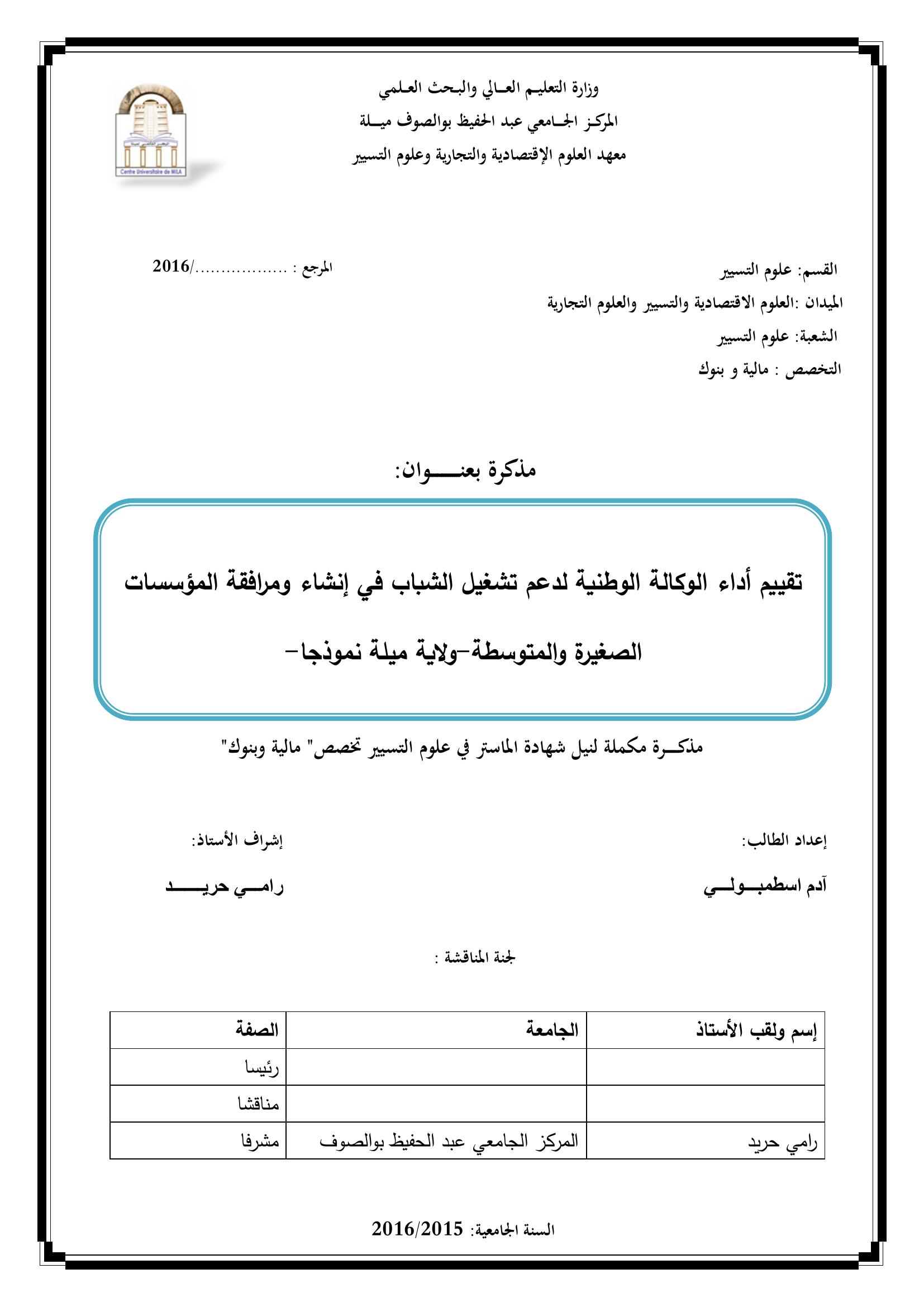 اسطمبولي آدم & حريد رامي (مشرفا) (2016). تقييم أداء الوكالة الوطنية لدعم تشغيل الشباب في إنشاء ومرافقة المؤسسات الصغيرة والمتوسطة ولاية ميلة نموذجا.