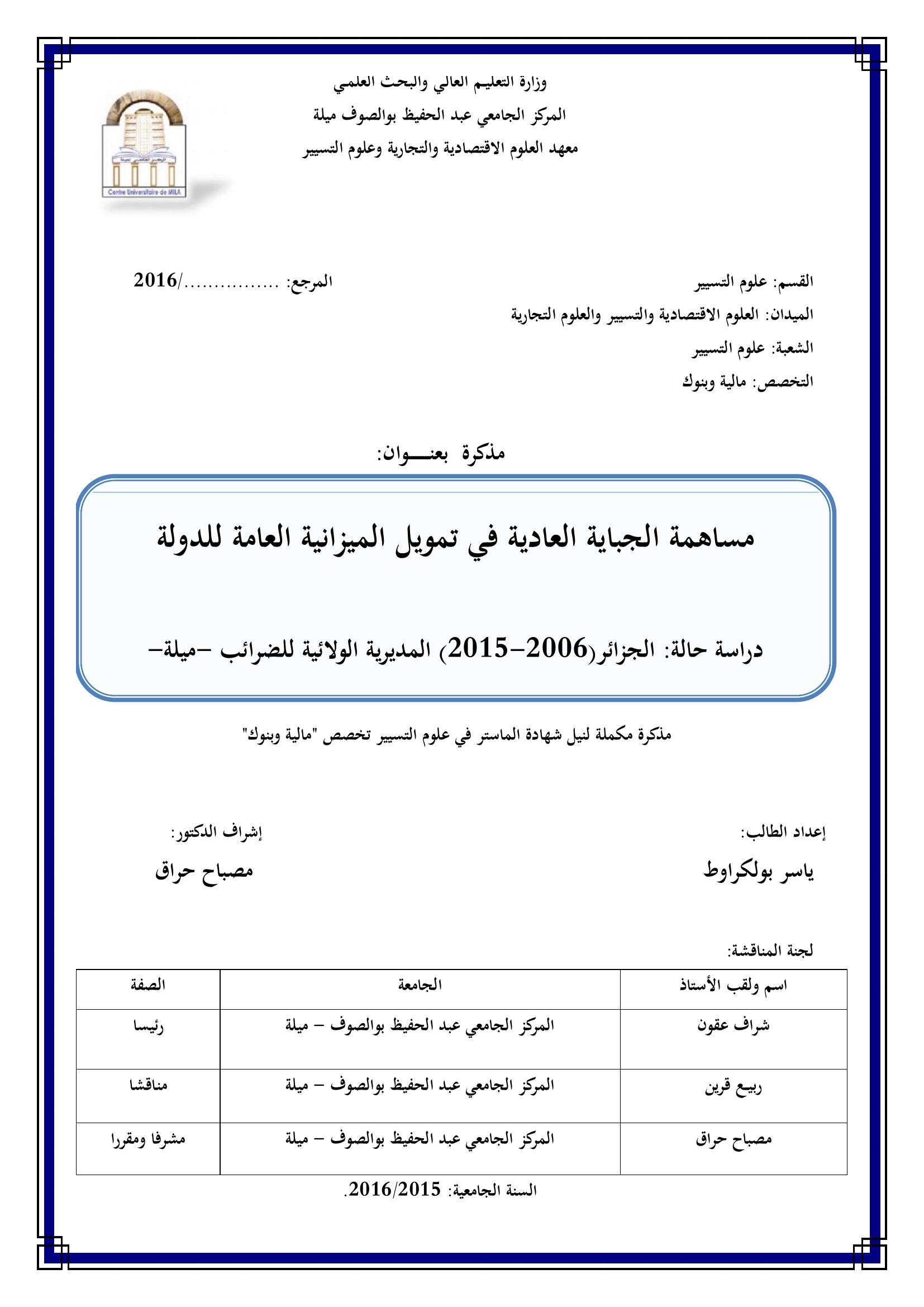 ياسر بولكراوط & عقون شراف (رئيسا), ق. (2016). مساهمة الجباية العادية في تمويل الميزانية العامة للدولة دراسة حالة : الجزائر (2006-2015) المديرية الولائية للضرائب -ميلة-.