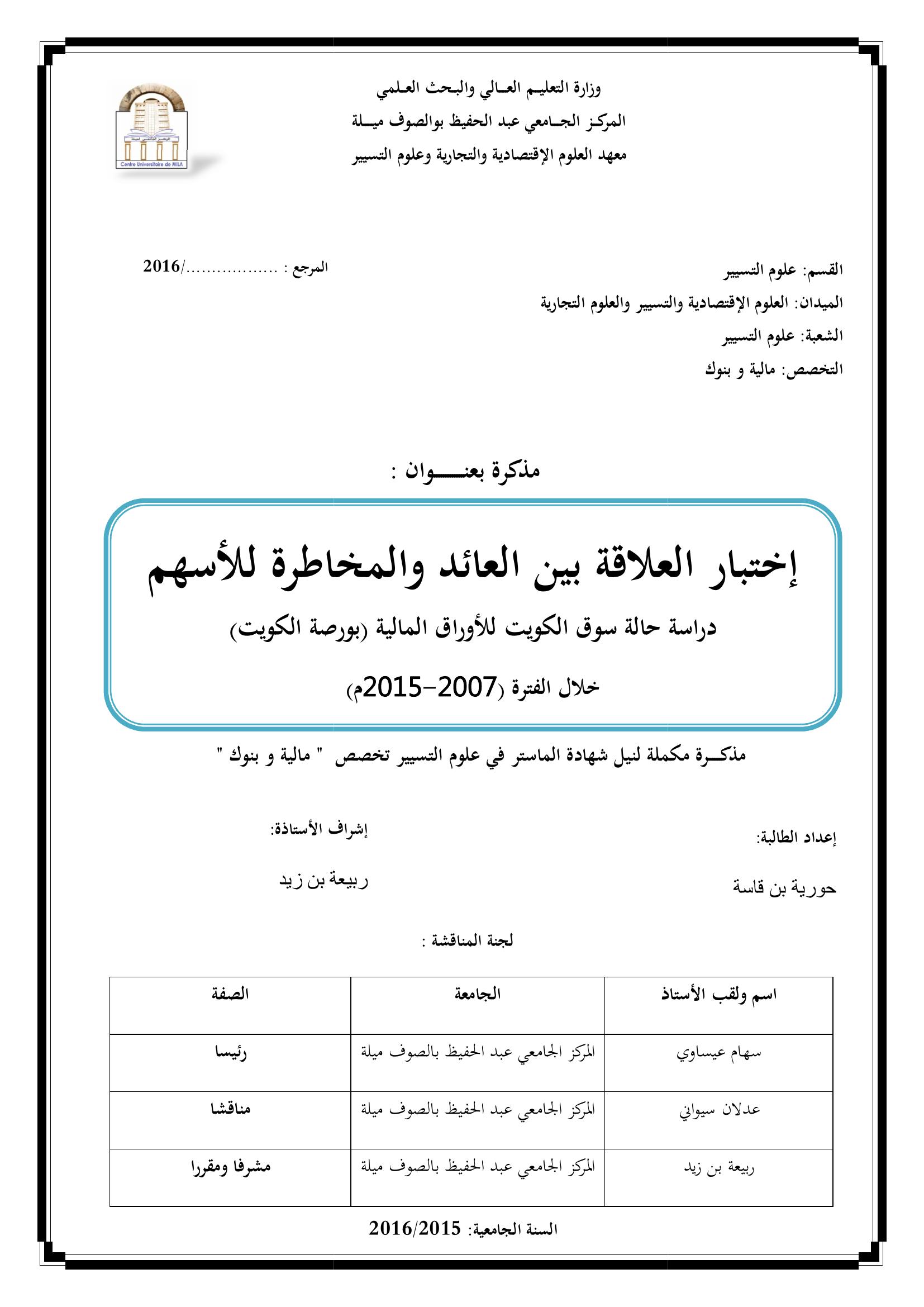 بن قاسة حورية & ،سهام عيساوي(رئيسا)، عدلان سيواني(مناقشا)، ربيعة بن زيد(مشرفا ومقررا) (2016). إختبار العلاقة بين العائد والمخاطرة للأسهم دراسة حالة سوق الكويت للأوراق المالية (بورصة الكويت) خلال الفترة (2007-2015م).