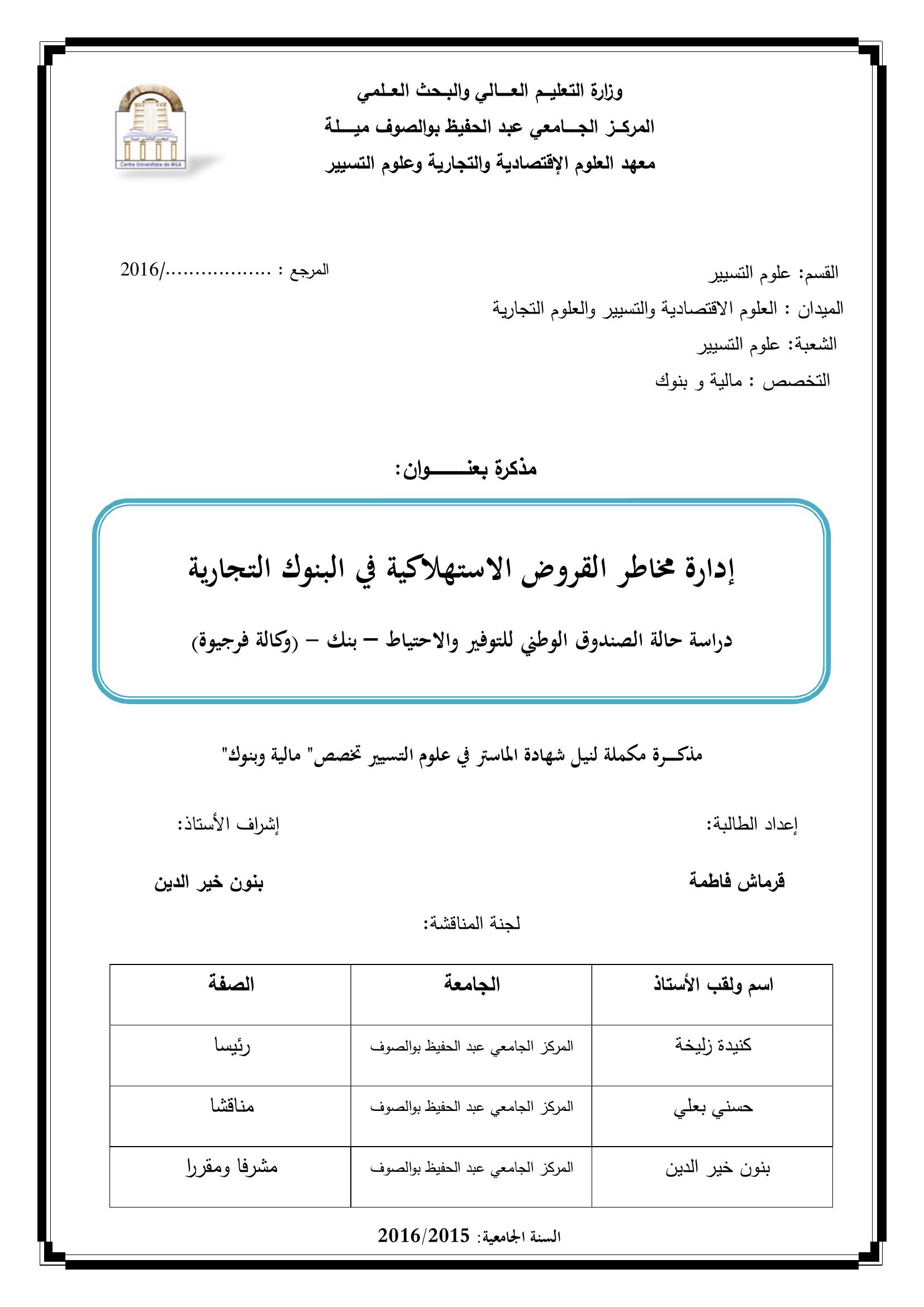 قرماش فاطمة & ،كنيدة زليخة(رئيسا)، حسني بعلي(مناقشا)، بنون خير الدين(مشرفا ومقررا) (2016). إدارة مخاطر القروض الإستهلاكية في البنوك التجارية : دراسة حالة الصندوق الوطني للتوفير والإحتياط -بنك (وكالة فرجيوة ).