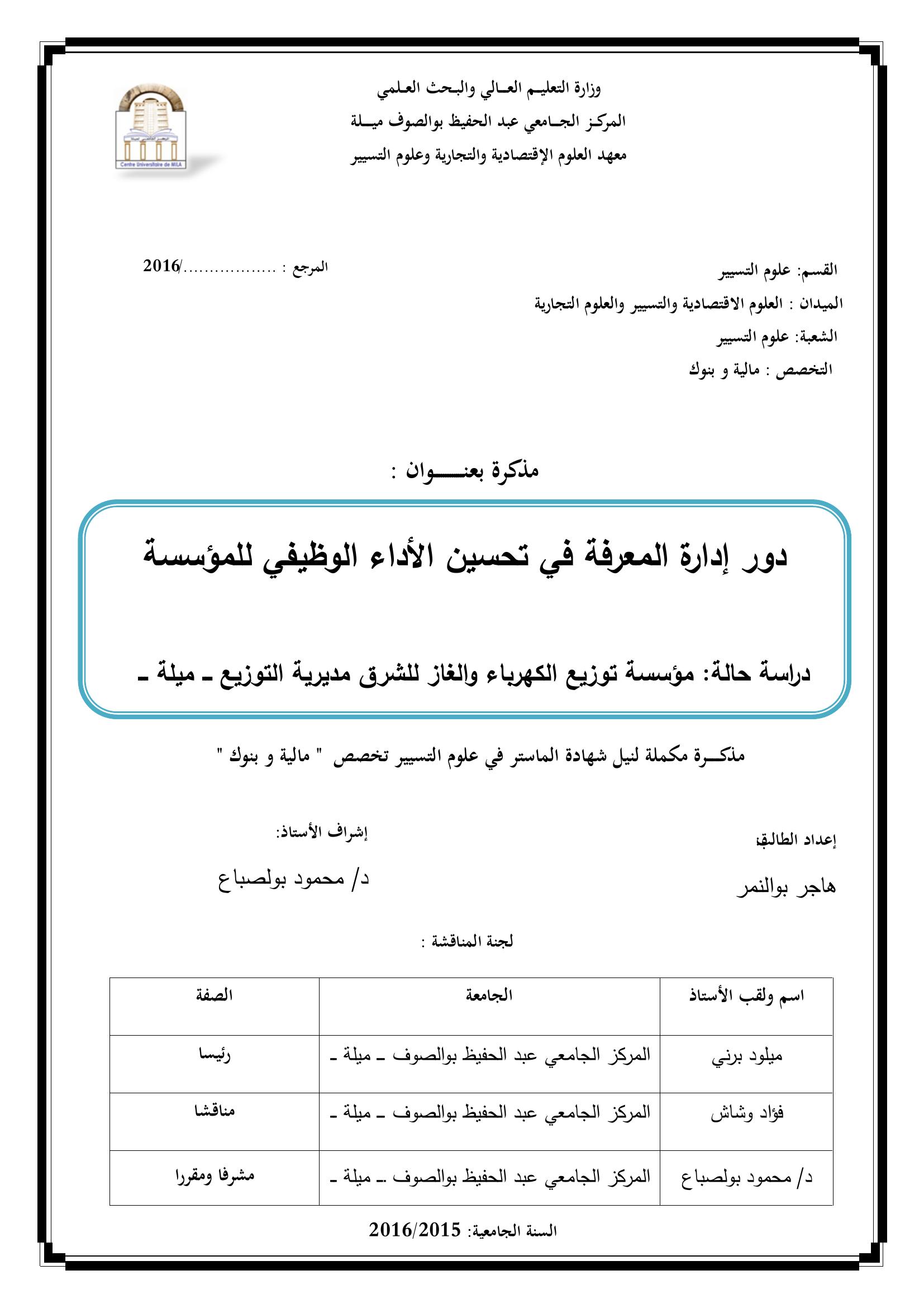 هاجر بوالنمر & ،ميلود برني(رئيسا)، فؤاد وشاش(مناقشا)، محمود بولصباع(مشرفا ومقررا) (2016). دور إدارة المعرفة في تحسين الأداء الوظيفي للمؤسسة دراسة حالة : مؤسسة توزيع الكهرباء و الغاز للشرق مديرية التوزيع -ميلة-.