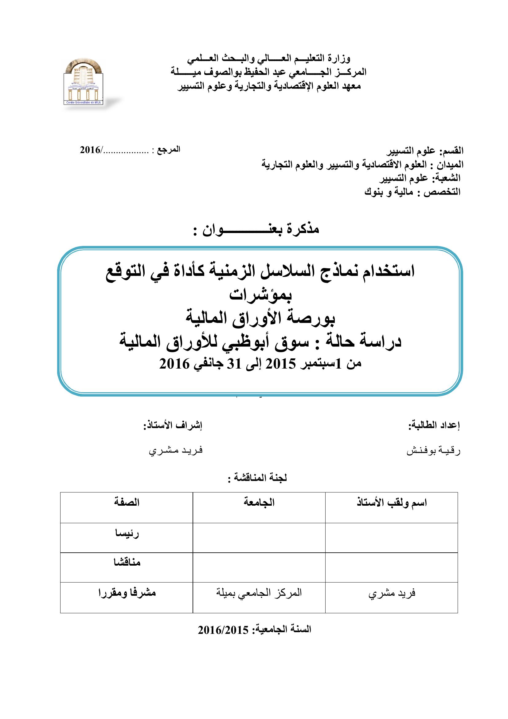 بوفنش رقية (مشرفا) & مشري فريد(مشرفا) (2016). استخدام نماذج السلاسل الزمنية كأداة في التوقيع بمؤشرات بورصة الأوراق المالية : دراسة حالة سوق أبوظبي للأوراق المالية من 1سبتمبر 2015 إلى 31جانفي 2016.