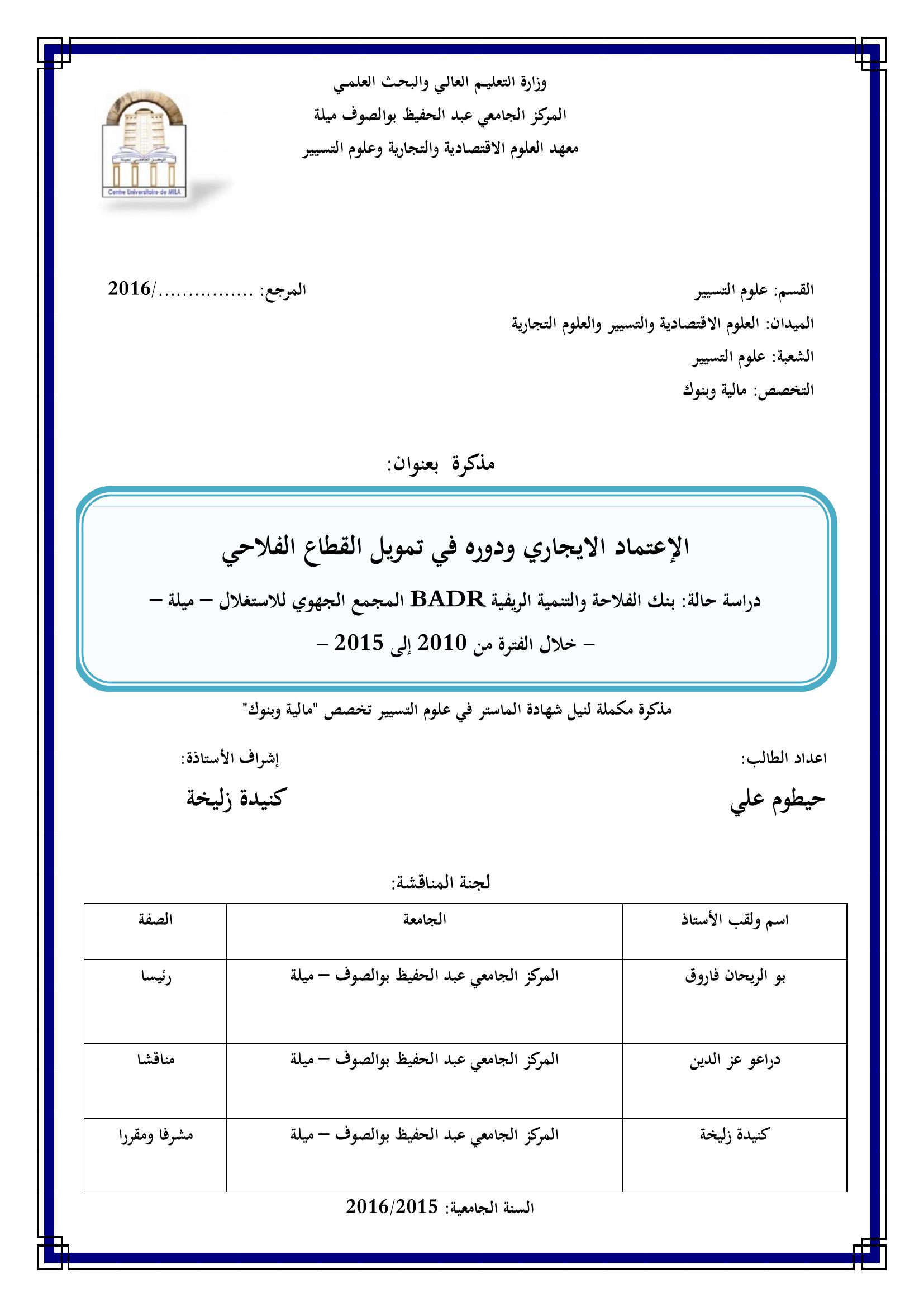 الإعتماد الايجاري و دوره في تمويل القطاع الفلاحي دراسة حالة بنك الفلاحة و التنمية الريفية BADR المجمع الجهوي للاسغلال -ميلة- خلال الفترة من 2010إلى 2015