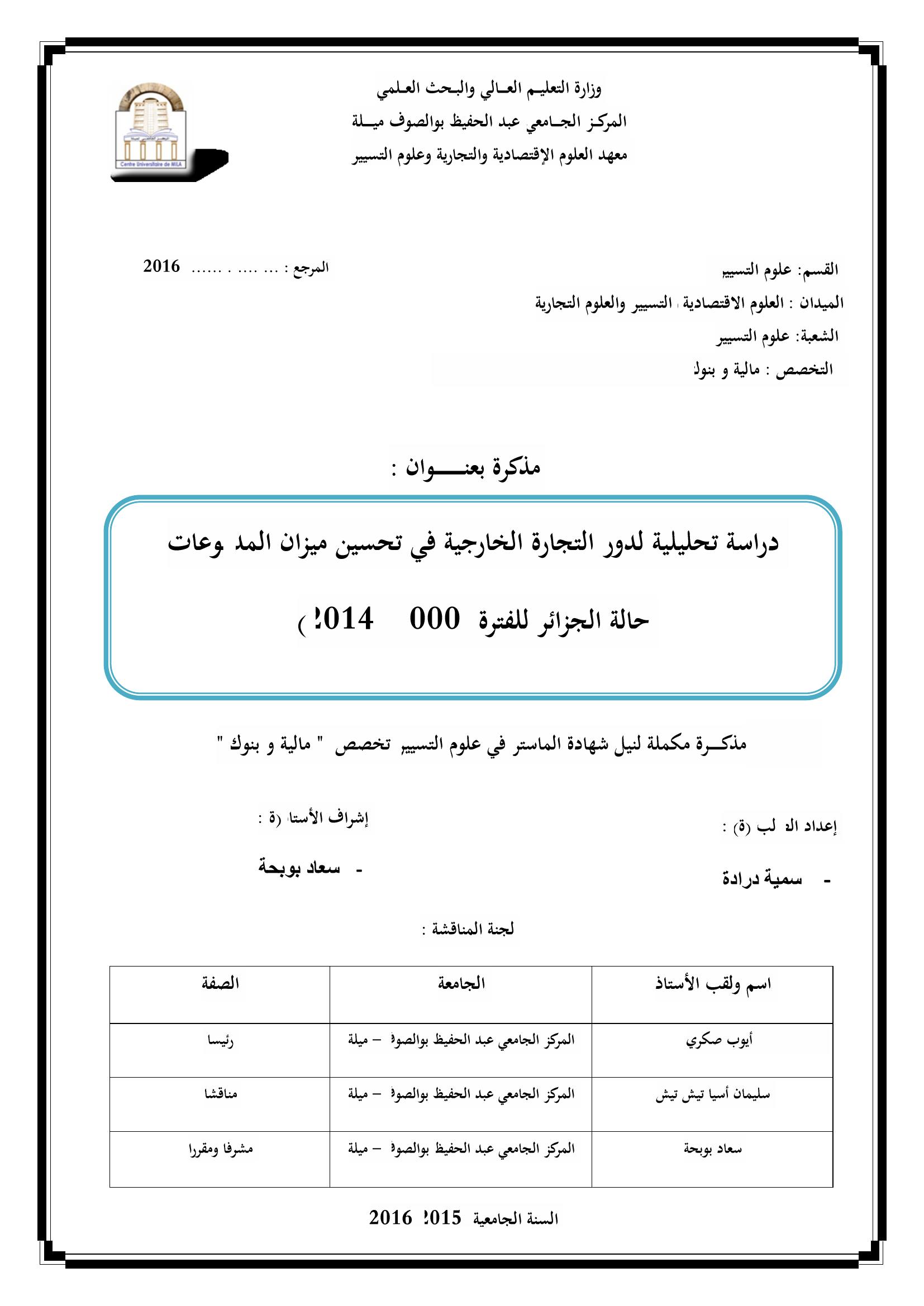 درادة سمية & أيوب صكري(رئيسا), س. (2016). دراسة تحليلية لدور التجارة الخارجية في تحسين ميزان المدفوعات حالة الجزائر للفترة (2000-2014).