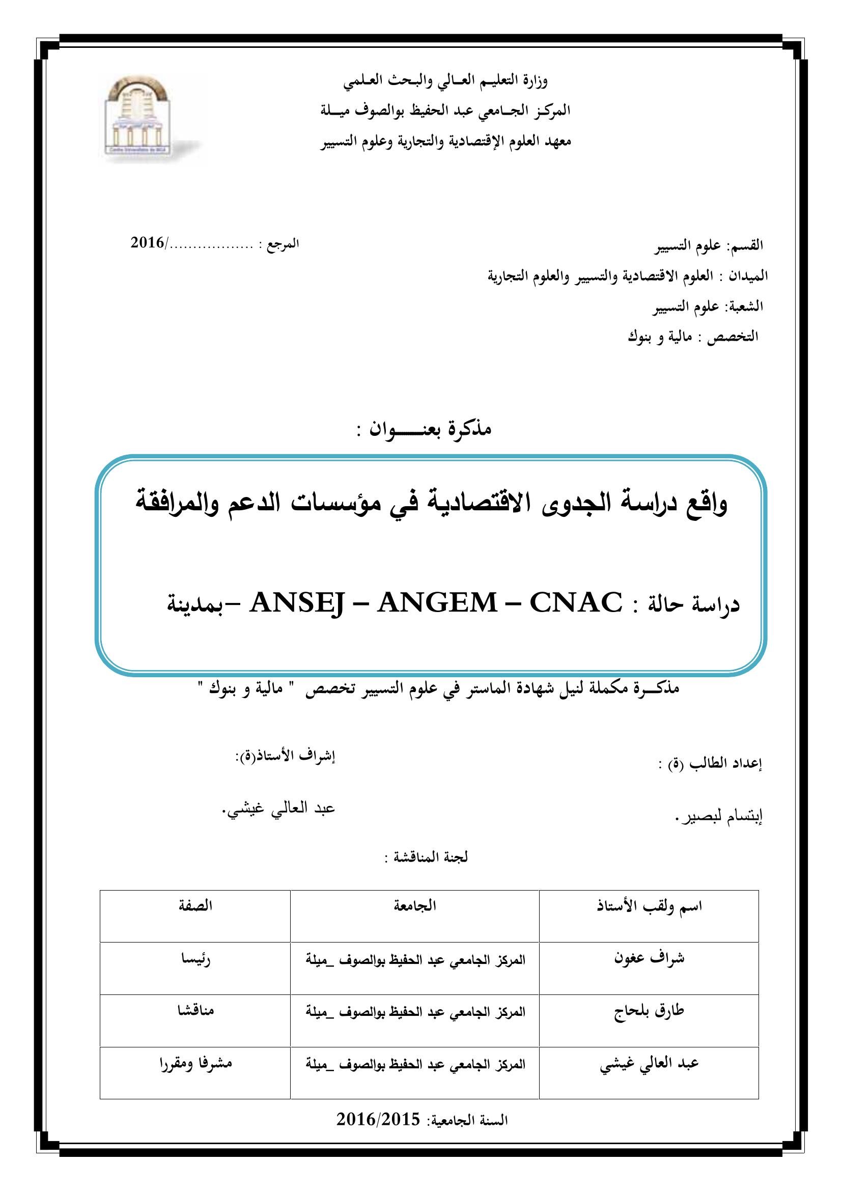 إبتسام لبصير & شراف عقون(رئيسا), ط. (2016). واقع دراسة الجدوى الاقتصادية في مؤسسات الدعم و المرافقة : دراسة حالة : CNAC-ANGEM-ANSEJ- بمدينة.