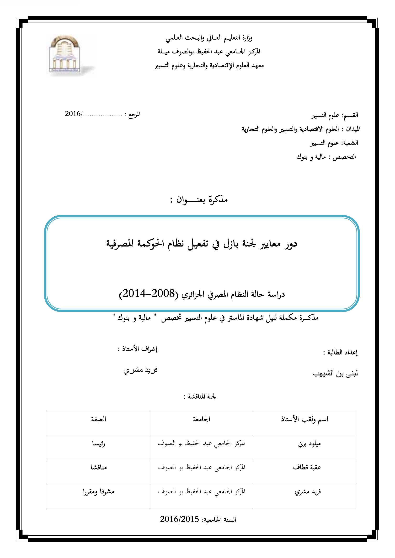 دور معايير لجنة بازل في تفعيل نظام الحوكمة المصرفية دراسة حالة النظام المصرفي الجزائري (2008-2014)