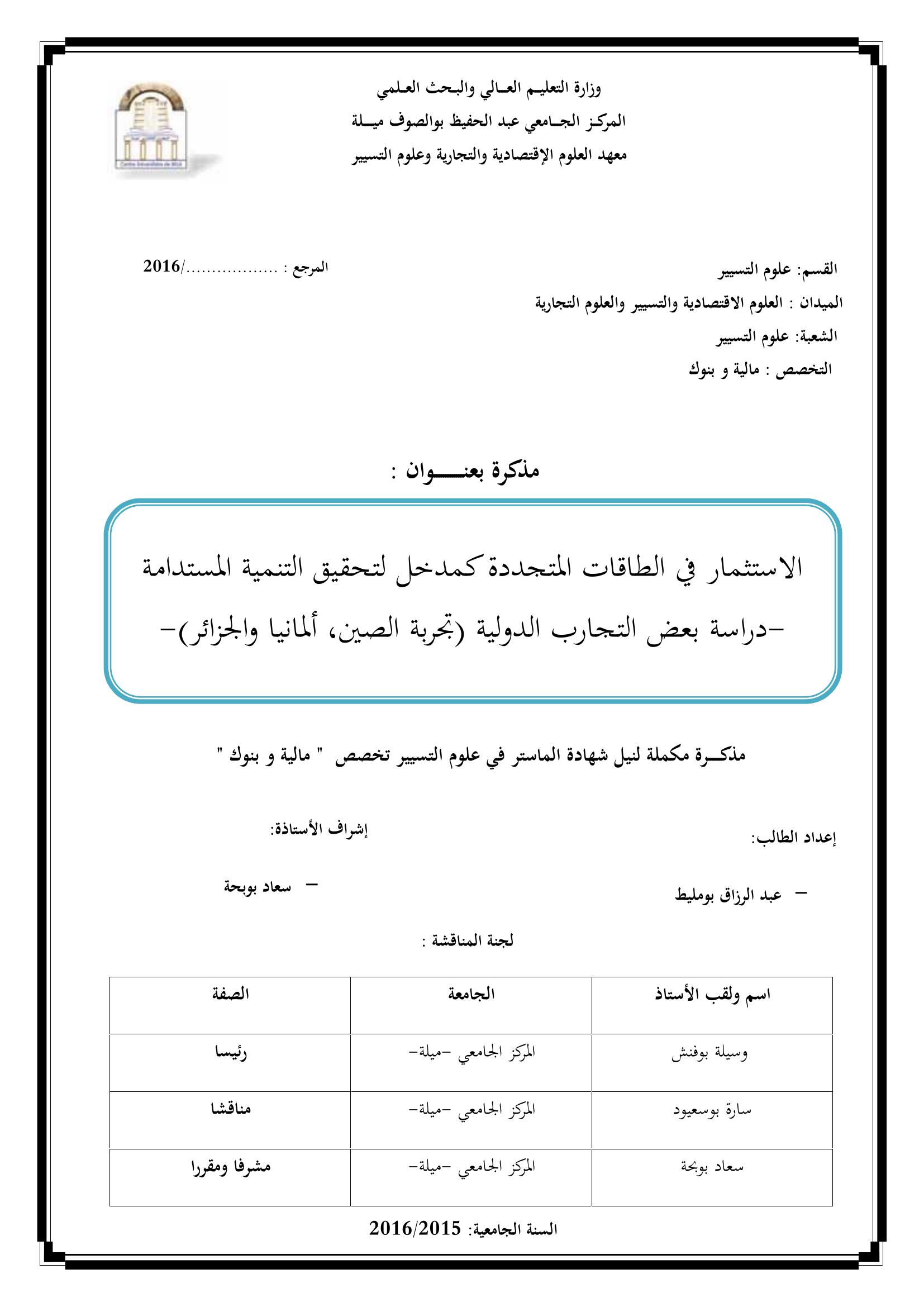 عبد الرزاق بومليط & وسيلة بوفنش(رئيسا), س. (2016). الاستثمار في الطاقات المتجددة كمدخل لتحقيق التنمية المستدامة - دراسة بعض التجارب الدولية (تجربة الصين,ألمانيا و الجزائر).