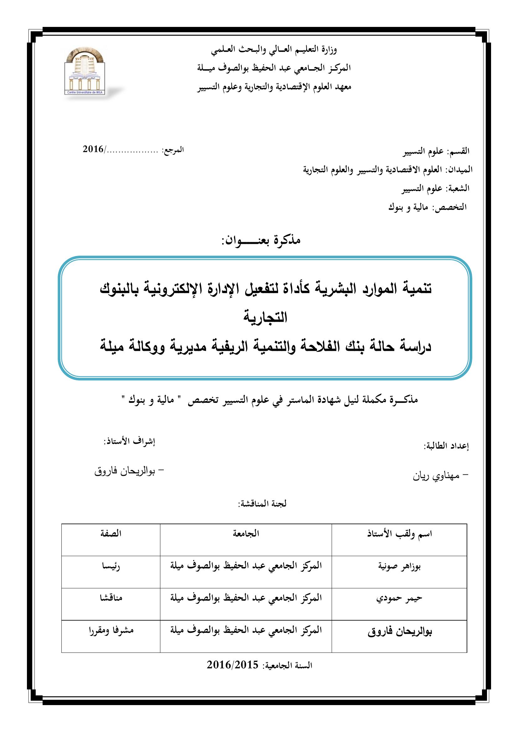 مهناوي ريان & ،بوزاهر صونية(رئيسا)، حيمر حمودي(مناقشا)، بوالريحان فاروق(مشرفا ومقررا) (2016). تنمية الموارد البشرية كأداة لتفعيل الإدارة الإلكترونية بالبنوك التجارية : دراسة حالة بنك الفلاحة والتنمية الريفية مديرية ووكالة ميلة.