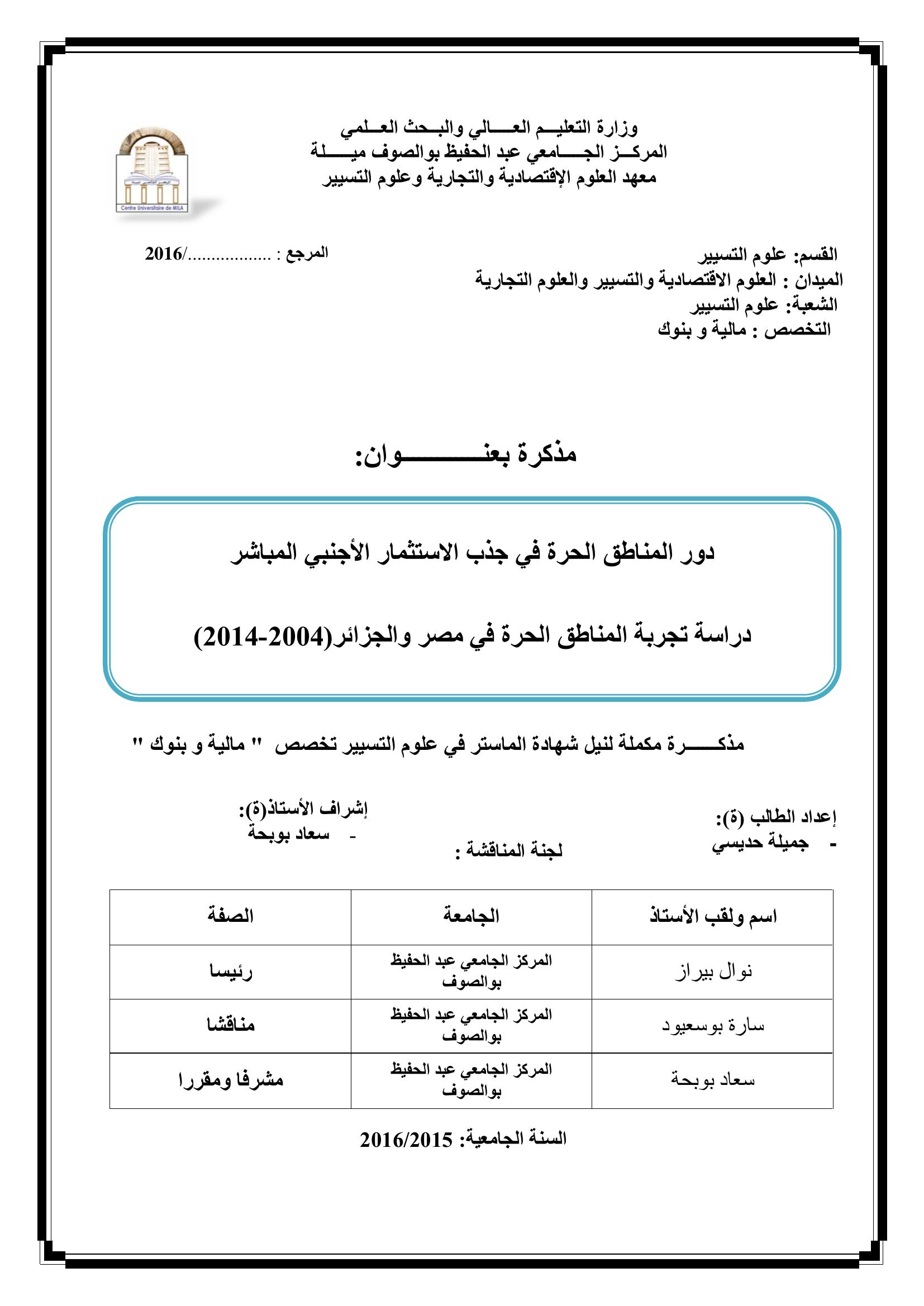 دور المناطق الحرة في جذب الاستثمار الأجنبي المباشر : دراسة تجربة المناطق الحرة في مصر و الجزائر (2004-2014)