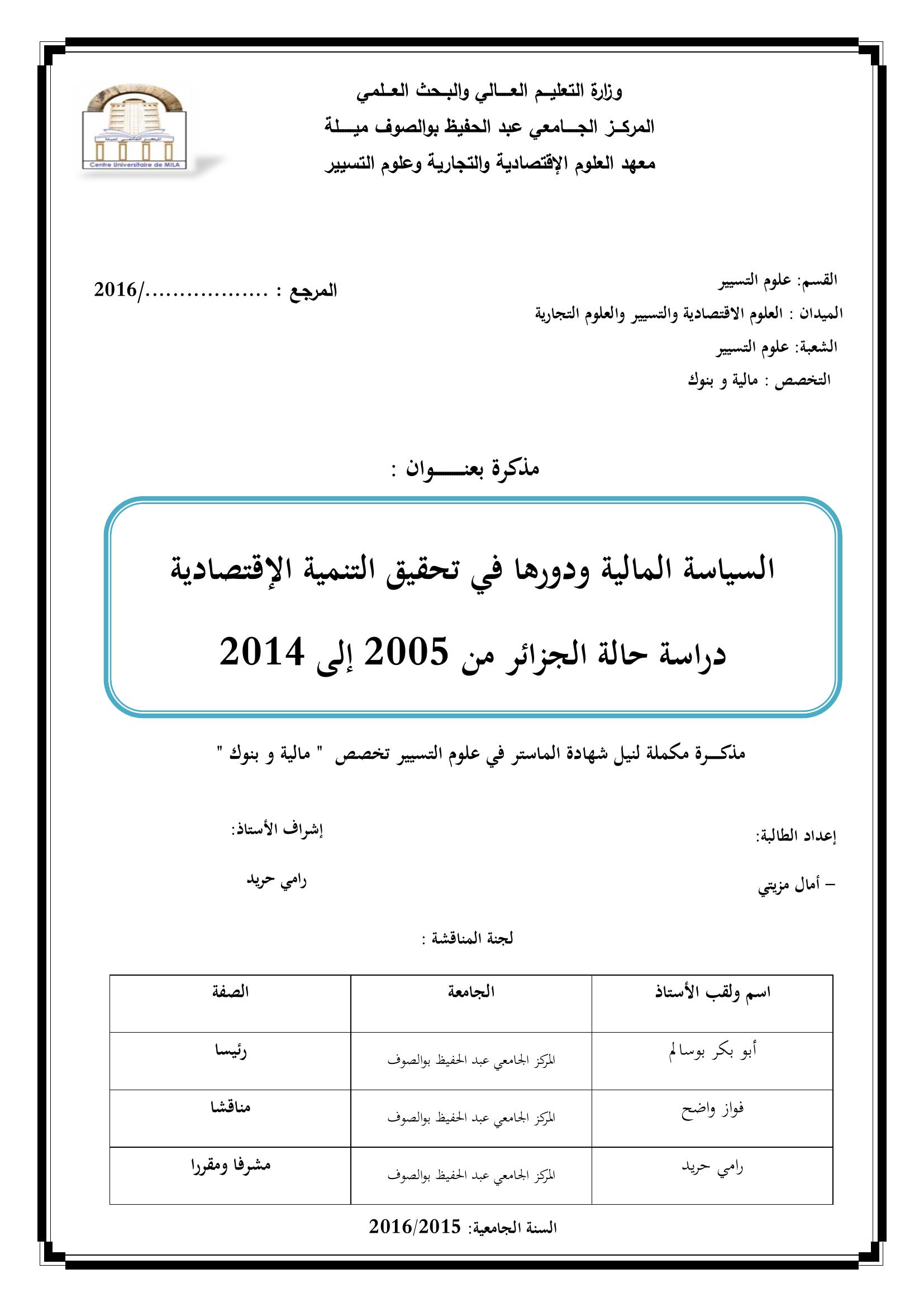 مزيتي أمال & أبوبكر بوسالم (رئيسا), و. (2016). السياسة المالية ودورها في تحقيق التنمية الإقتصادية دراسة حالة الجزائر من 2005إلى 2014.