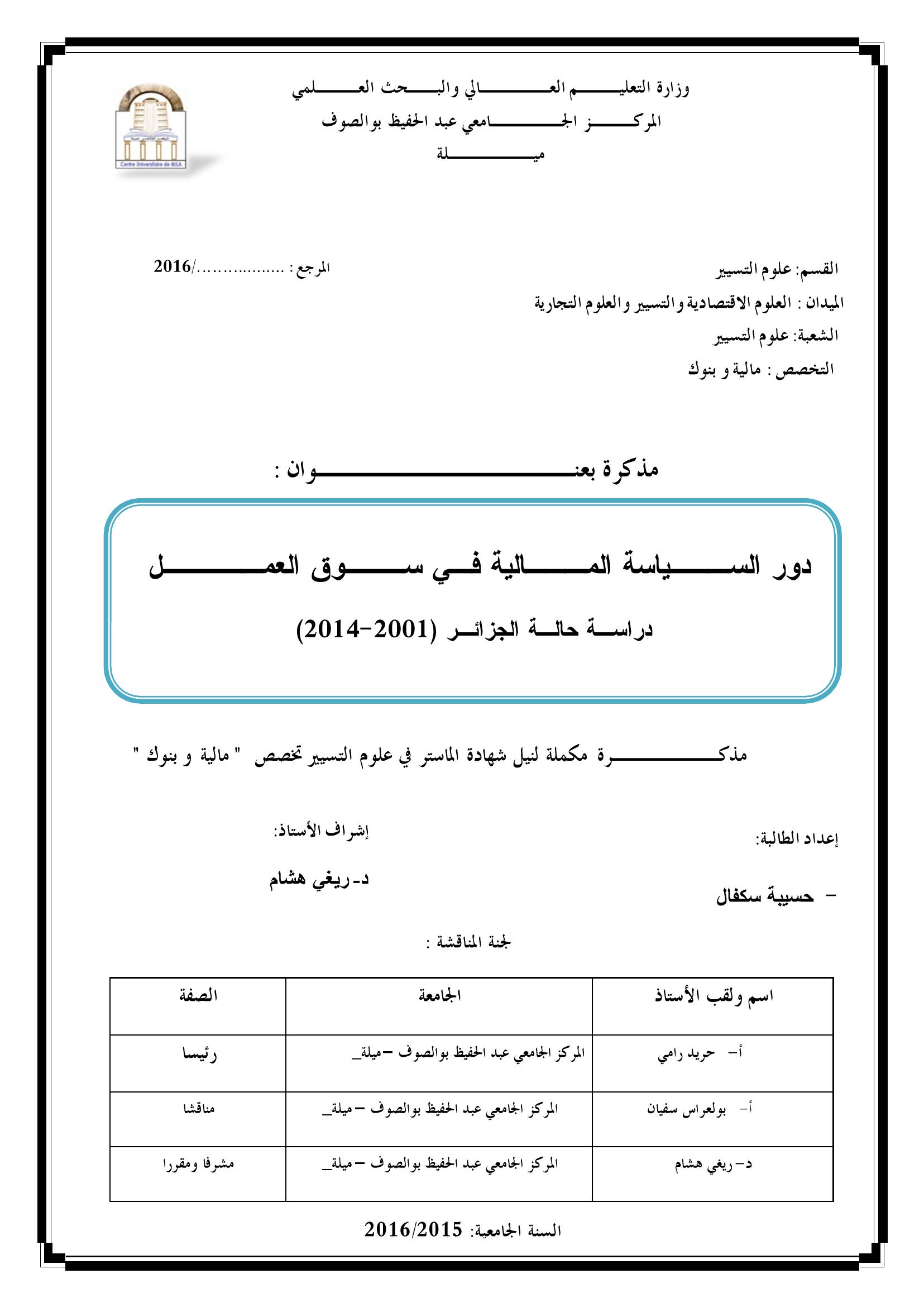 سكفال حسيبة & حريد رامي (رئيسا), ب. (2016). دور السياسة المالية في سوق العمل دراسة حالة الجزائر (2001-2014).