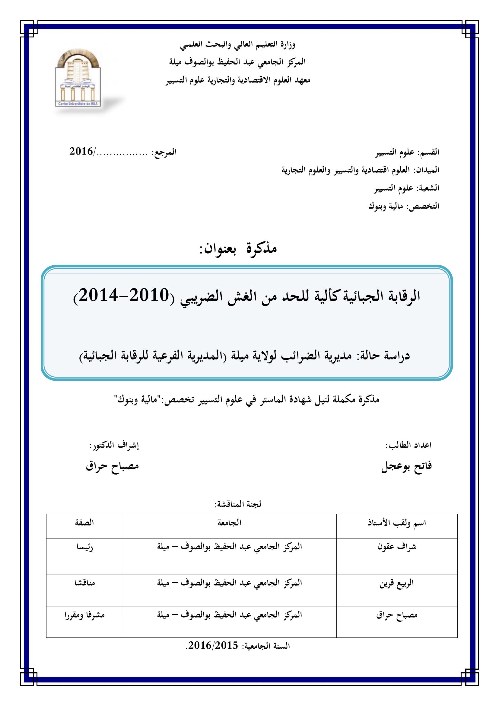الرقابة الجبائية للحد من الغش الضريبي (2010-2014) : دراسة حالة مديرية الضرائب لولاية ميلة ( المديرية الفرعية للرقابة الجبائية )