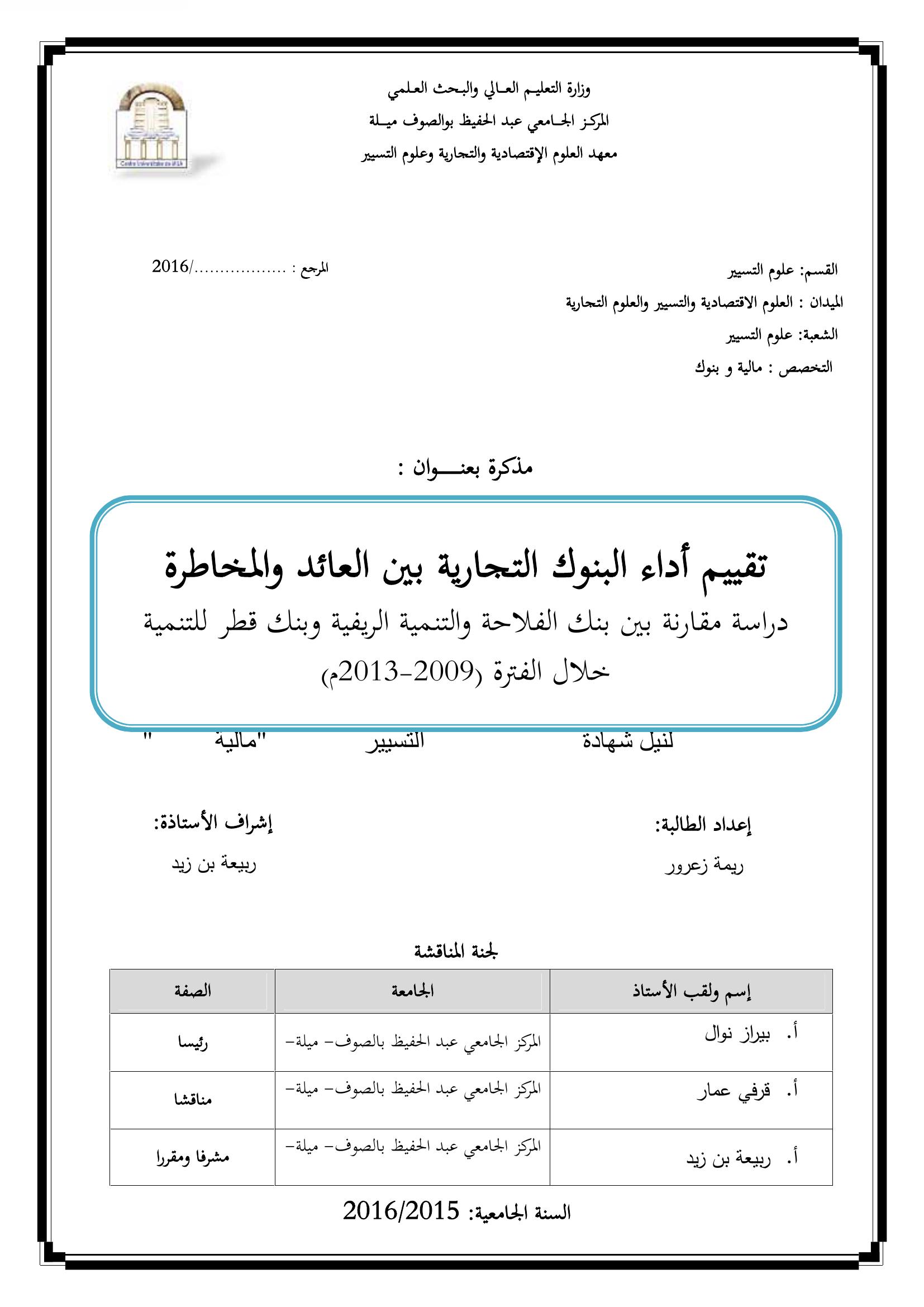 زعرور ريمة & أ. بيراز نوال (رئيسا), ق. (2016). تقييم أداء البنوك التجارية بين العائد والمخاطرة دراسة مقارنة بين بنك الفلاحة والتنمية الريفية وبنك قطر للتنمية خلال الفترة (2009-2013).