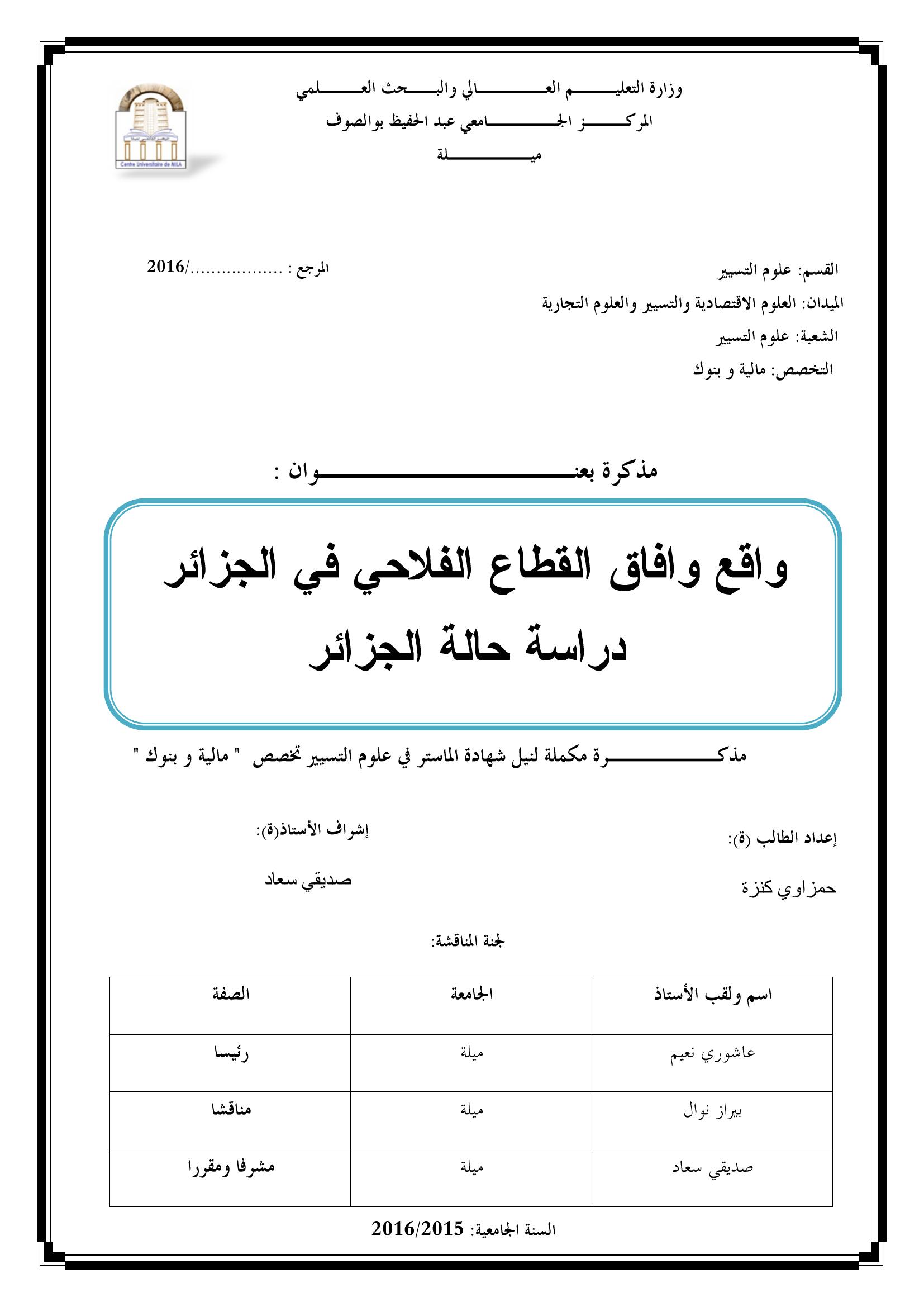 حمزاوي كنزة & عاشوري نعيم(رئيسا), ب. (2016). واقع و افاق القطاع الفلاحي في الجزائر دراسة حالة الجزائر.