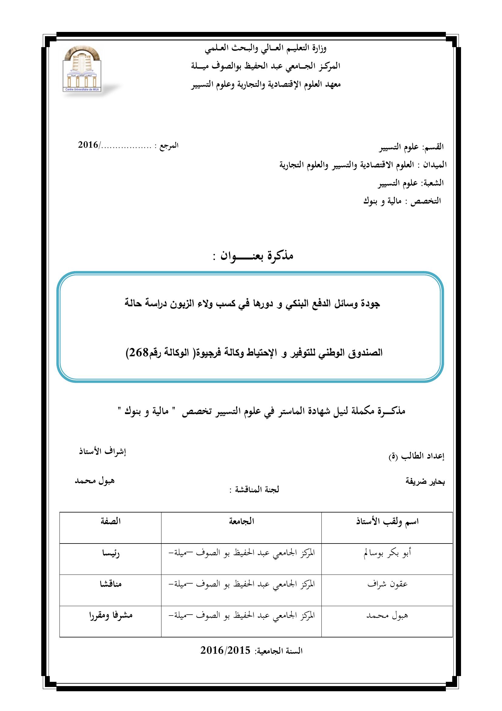 بحاير ضريفة & أبو بكر بوسالم(رئيسا), ع. (2016). جودة وسائل الدفع البنكي ودورها في كسب ولاء الزبون دراسة حالة الصندوق الوطني للتوفير والإحتياط وكالة فرجيوة (الوكالة رقم 268).