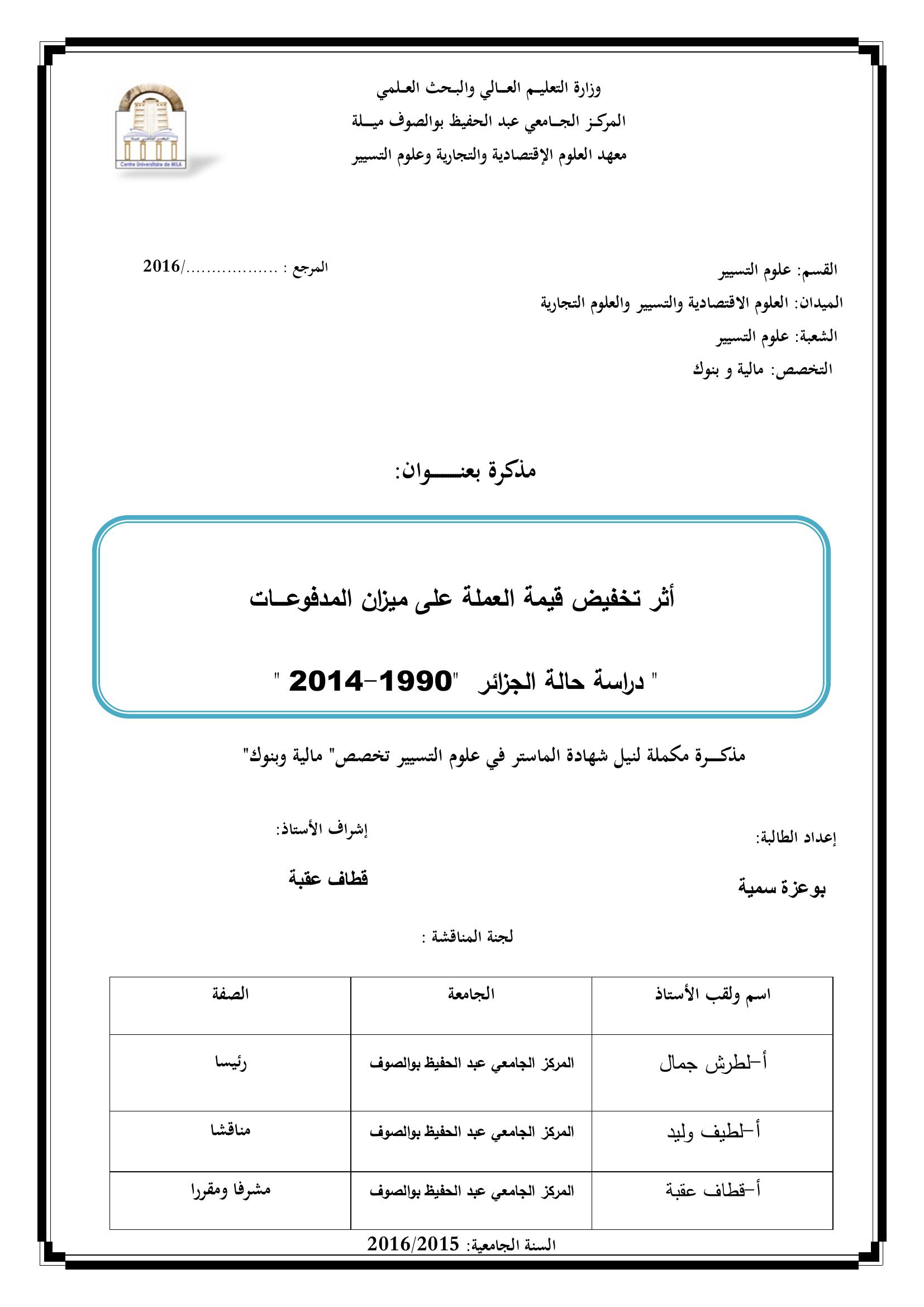 بوعزة سمية & لطرش جمال (رئيسا), ل. (2016). أثر تخفيض قيمة العملة على ميزان المدفوعات دراسة حالة الجزائر 1990-2014.