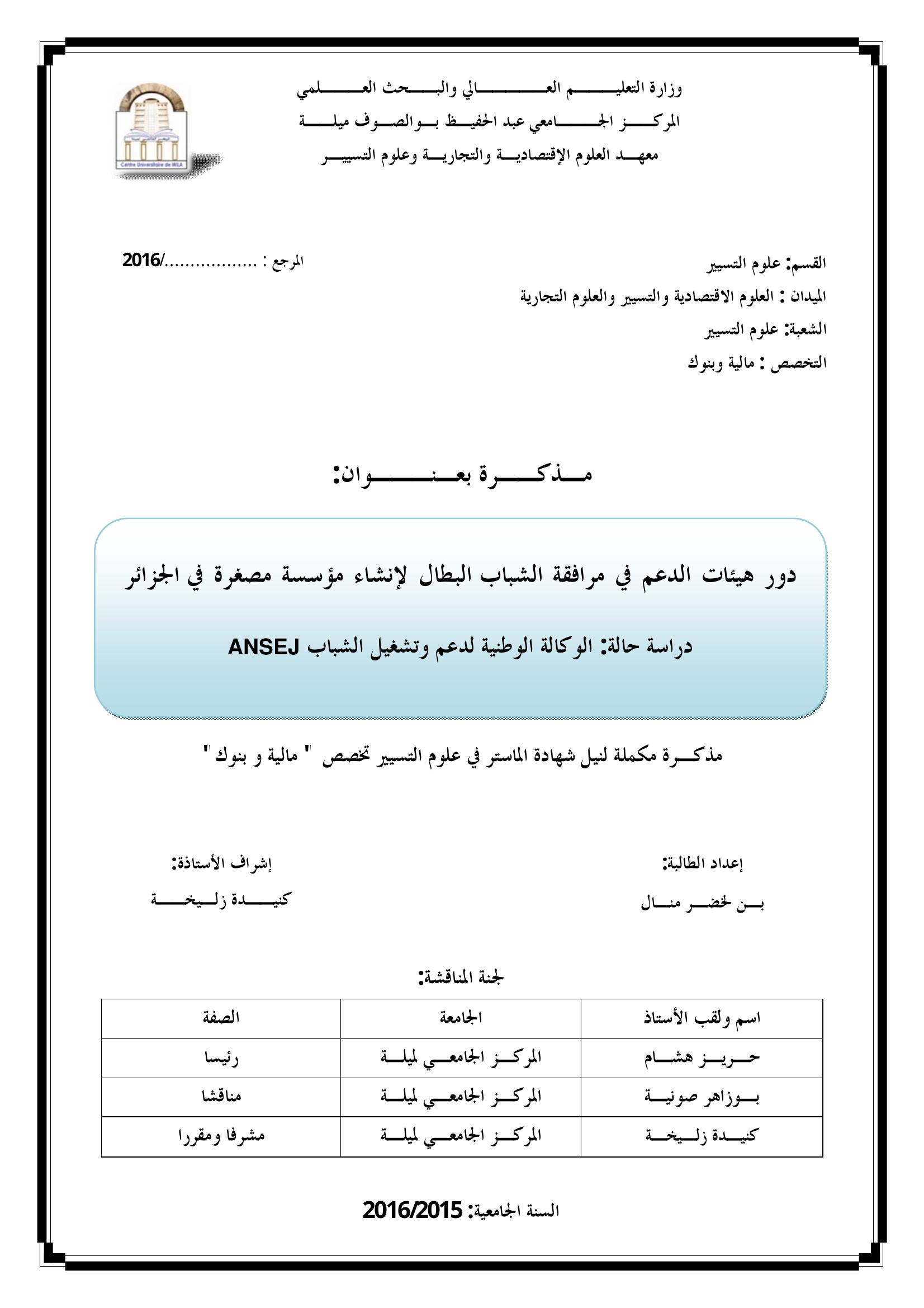 بن لخضر منال & ،حريز هشام(رئيسا)، بوزاهر صونية(مناقشا)، كنيدة زليخة(مشرفا ومقررا) (2016). دور هيئات الدعم في مرافقة الشباب البطال لإنشاء مؤسسة مصغرة في الجزائر : دراسة حالة الوكالة الوطنية لدعم وتشغيل الشباب ANSEJ.
