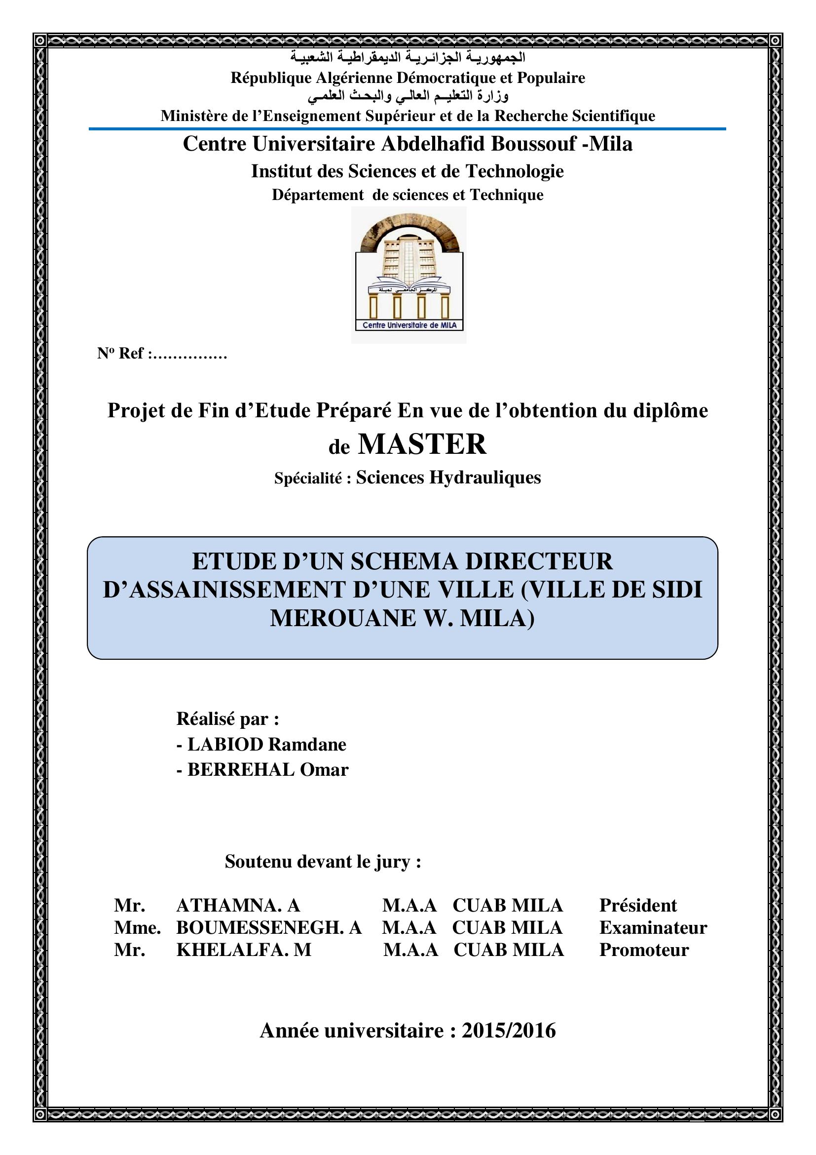 Labiod Ramdane & ATHAMNA. A Président, B. (2016). etude d'un schema directeur d'assainissement d'une ville (ville de sidi merouane w.mila).