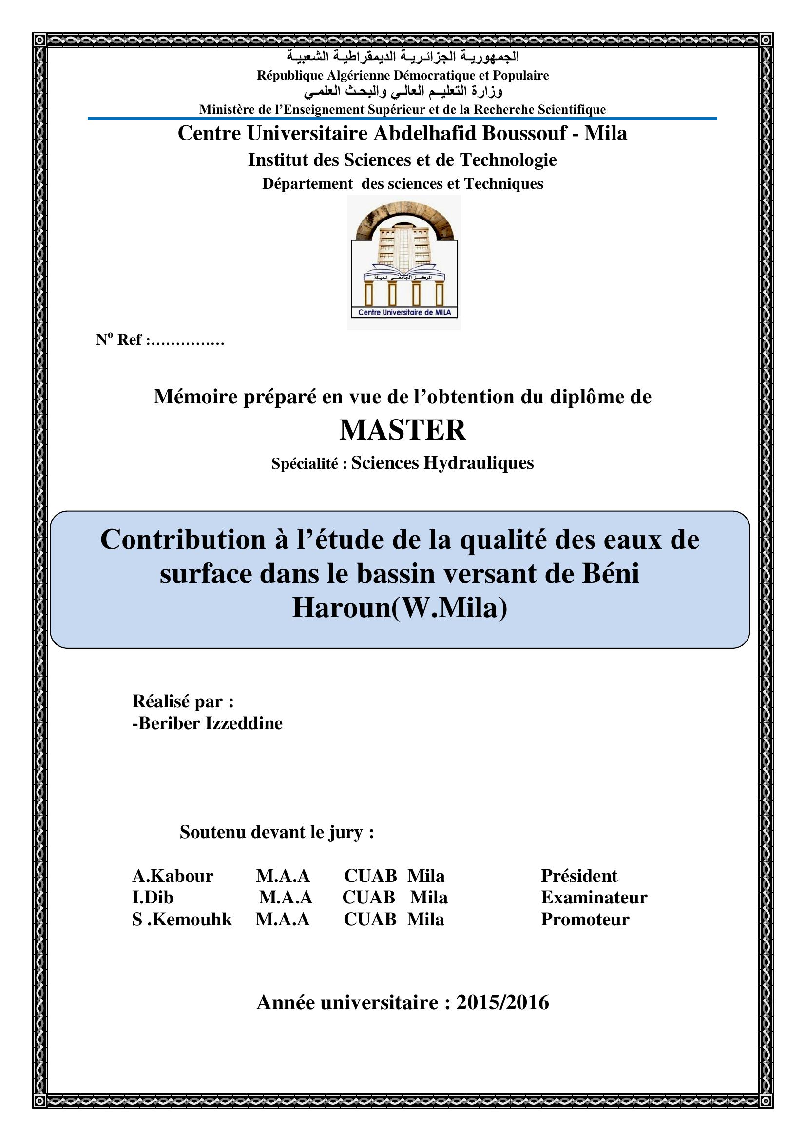 beriber izzeddine & A.Kabour Président, I. (2016). contribution à l'étude de la qualité des eaux de surface dans le bassin versant de béni haroun (w.mila ).