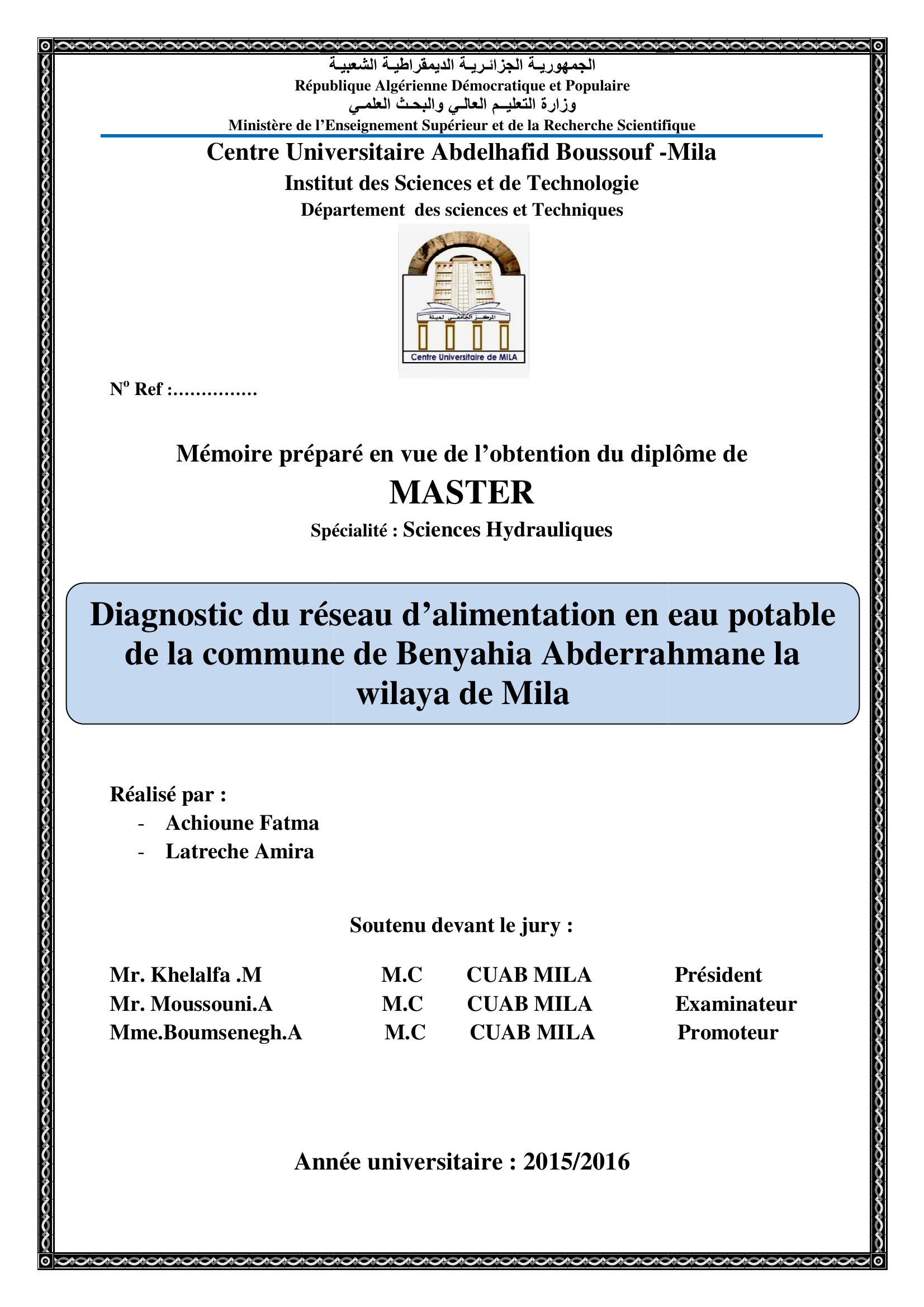 Diagnostic du réeau d'alimentation en eau potable de la commune de benyahia abderrahmane de la wilaya de mila