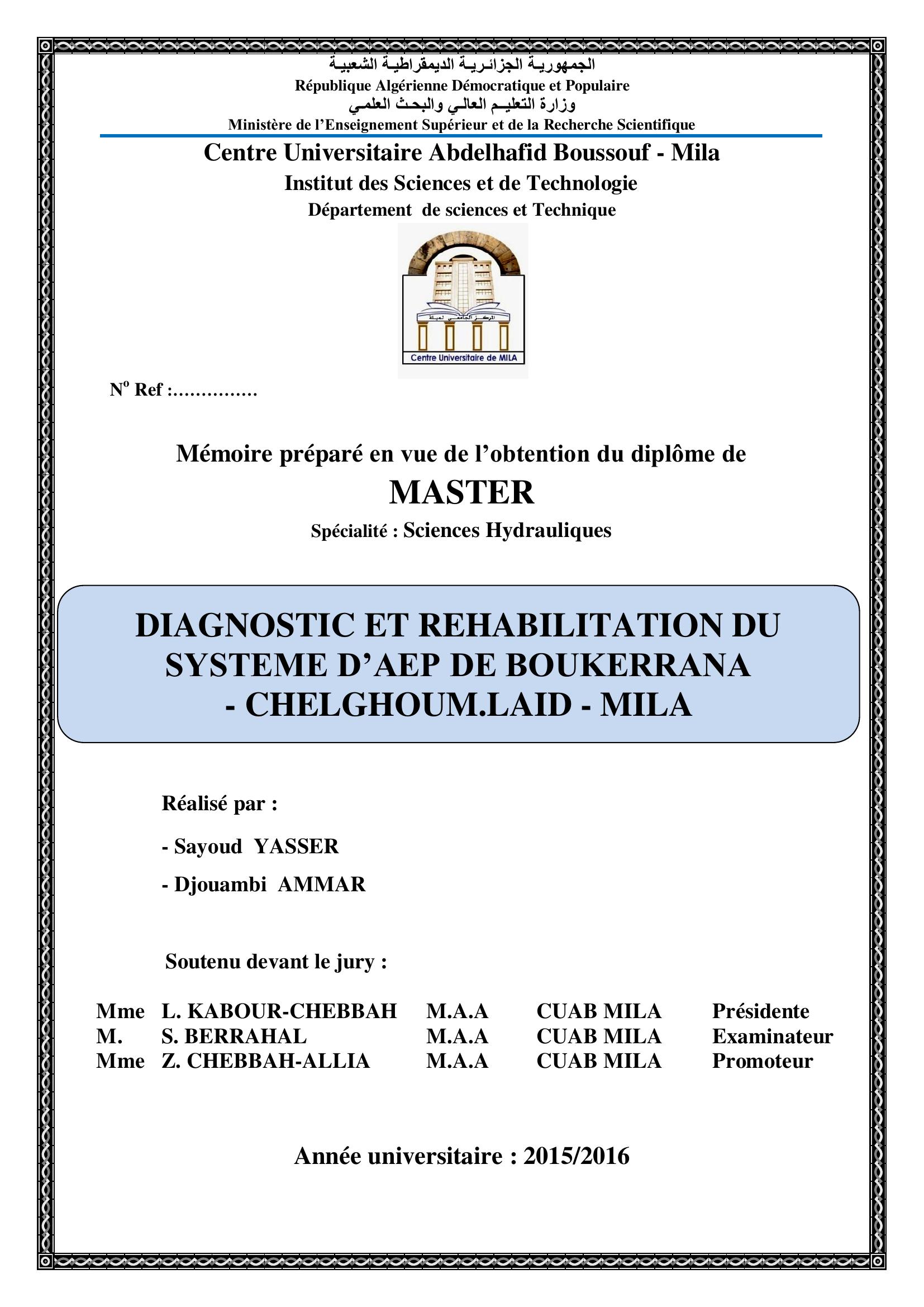Sayoud Yasser & L. KABOUR-CHEBBAH Présidente, S. (2016). Diagnostic et rehabilitation du systeme d'AEP de boukerrana chelghoum.laid mila.