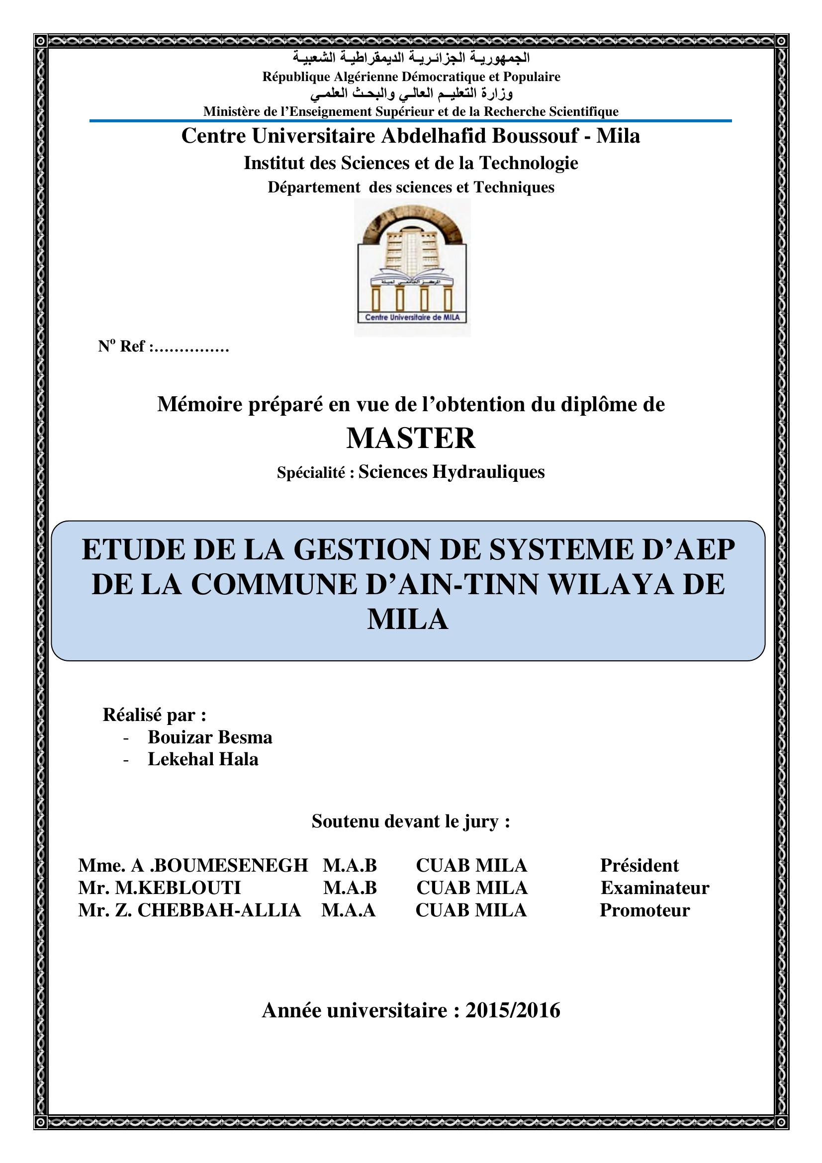 bouizar besma & A .BOUMESENEGH Président, M. (2016). etude de la gestion de system d'aep de la commune d'ain-tinn wilaya de mila.