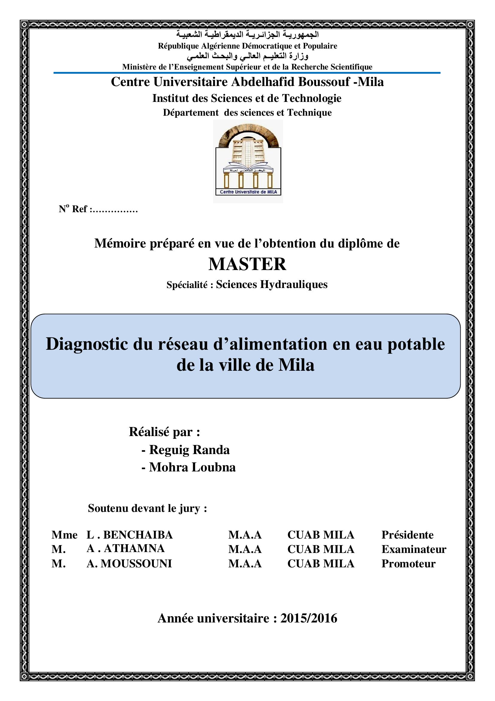 Reguig Randa & L . BENCHAIBA Présidente, A. (2016). Diagnostic du réseau d'alimentation en eau potable de la ville de mila.